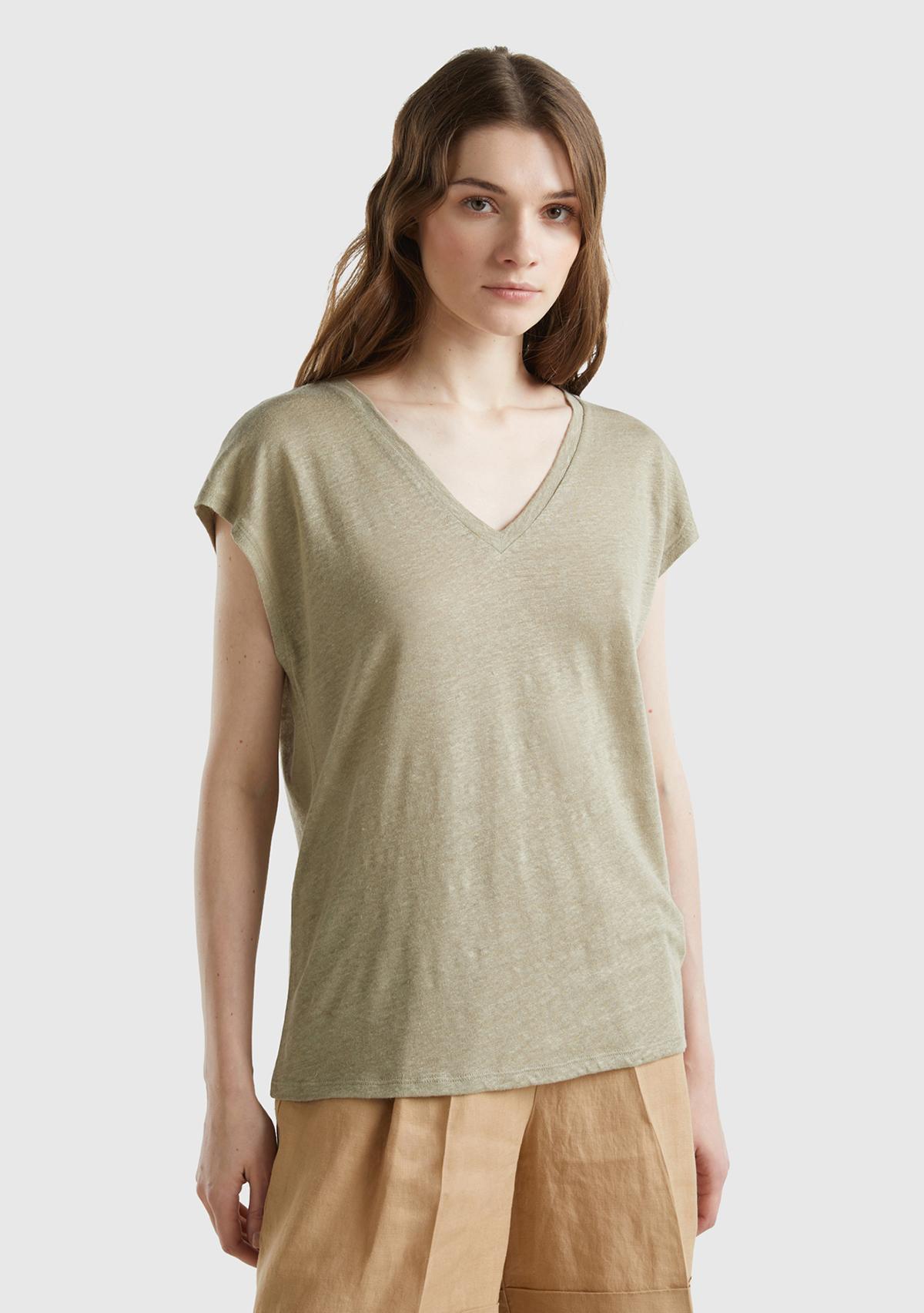 Kadın Haki %100 Keten Rahat Kalıp Derin V Yaka Kolsuz T-Shirt