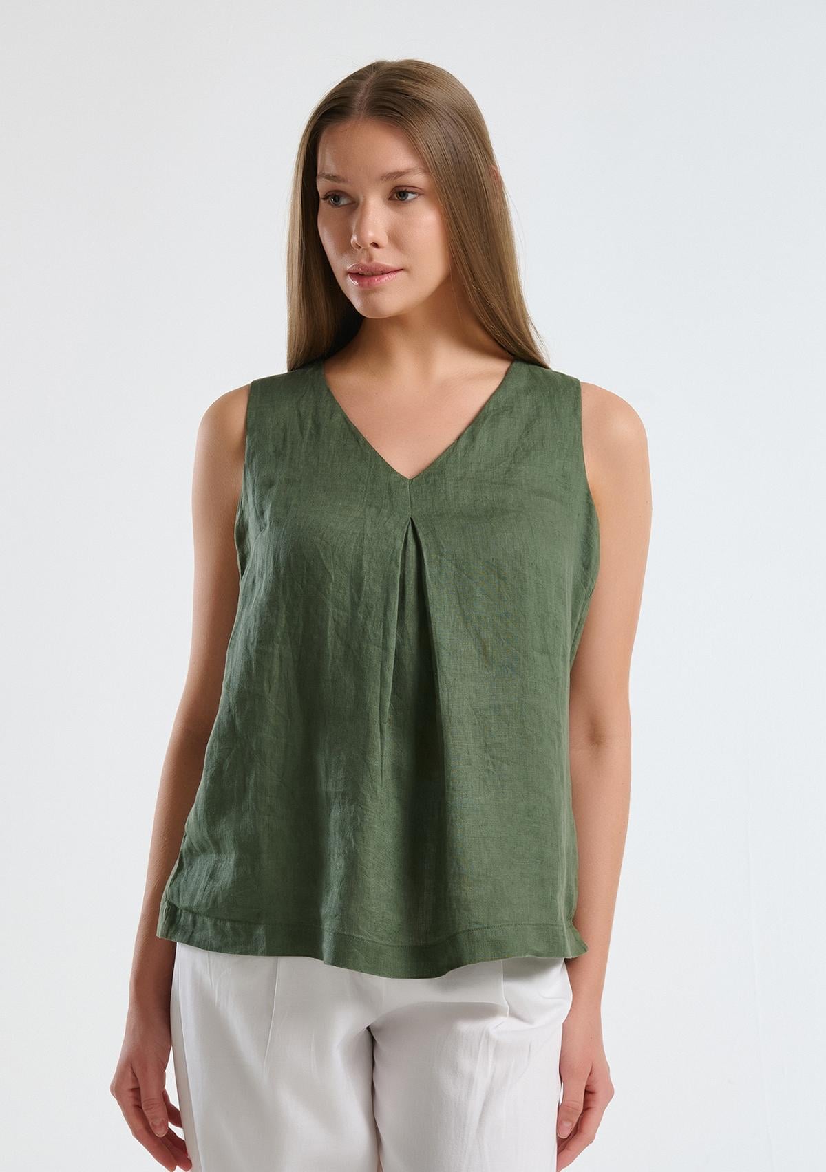 Kadın Haki %100 Keten V Yaka Kolsuz Geniş Kesim Bluz