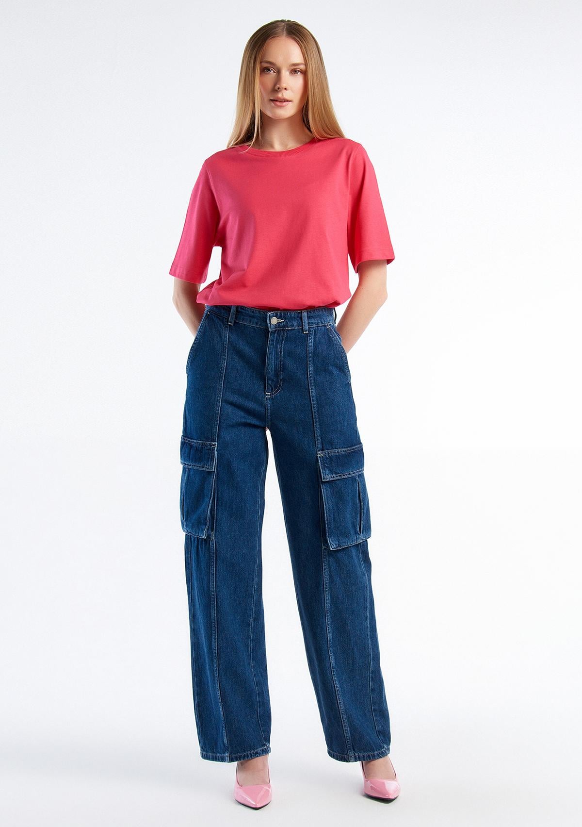 Kadın İndigo %100 Pamuk Arkası Logo Etiketli Yama Cepli Pantolon