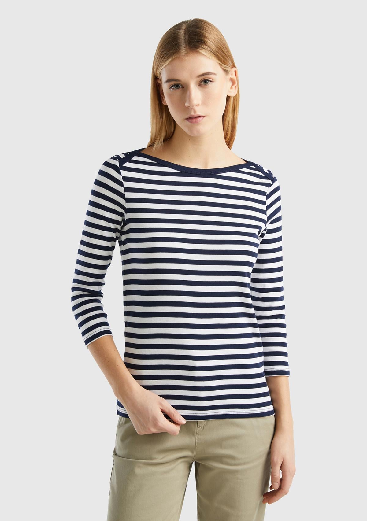 Kadın İndigo Truvakar Kol Çizgili T-shirt