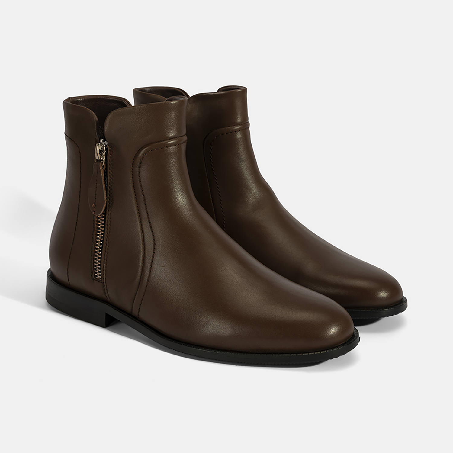 %100 deri, deri iç tabanlı, deri astarlı, çift fermuar detaylı, TPU tabanlı kadın bot. Topuk yüksekliği: 2 cm.