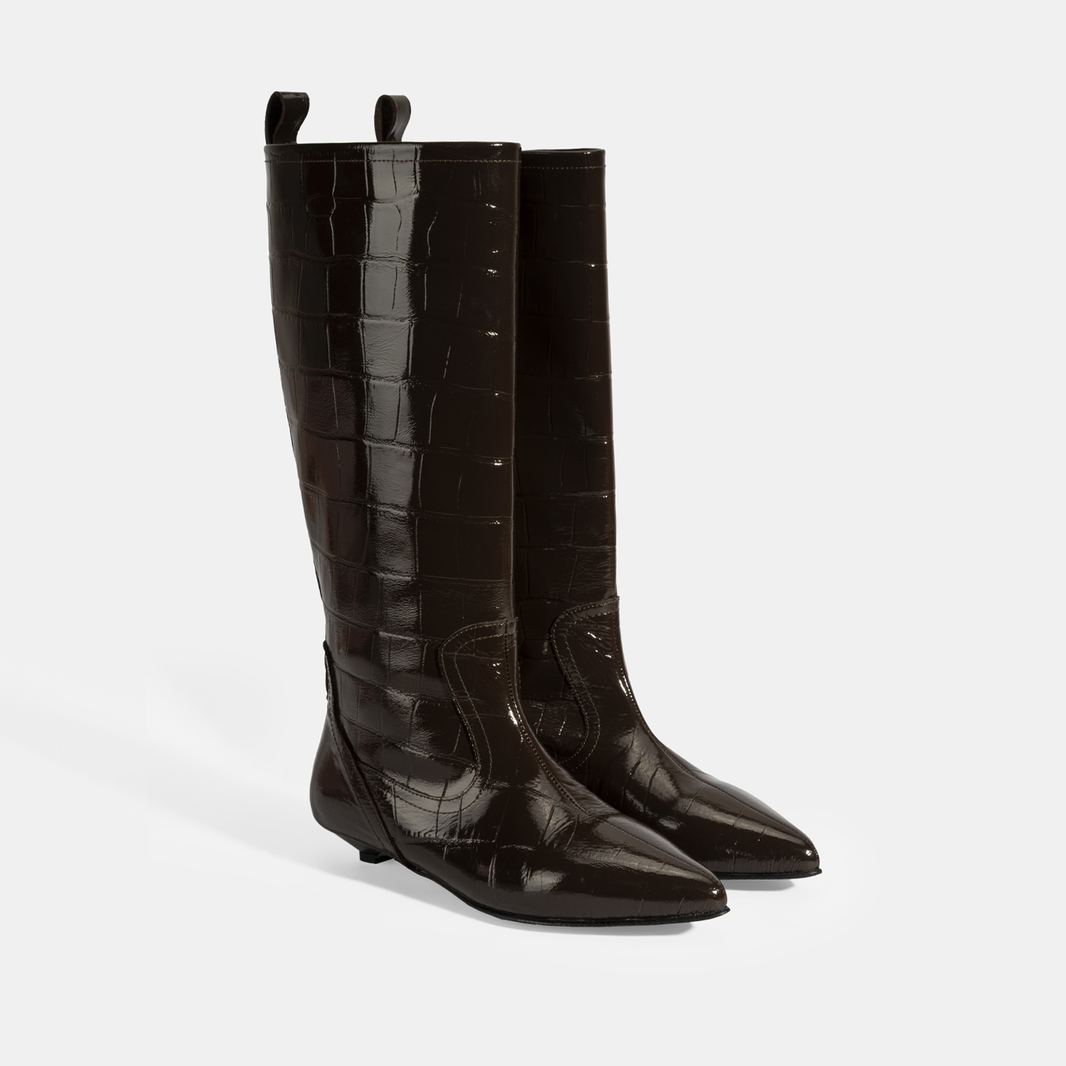 Kadın Kahve Kroko Baskılı İnce Topuklu Rugan Deri Çizme