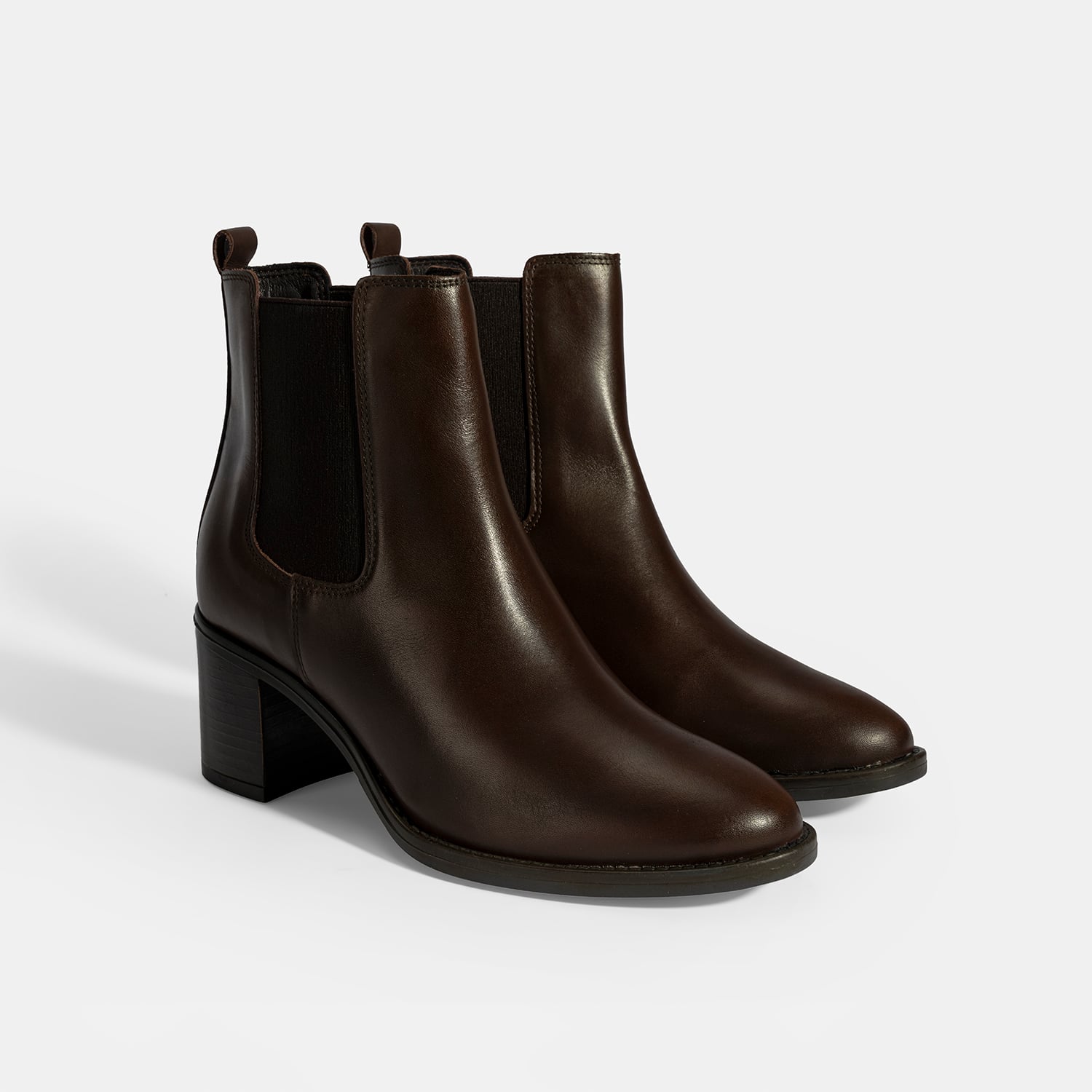 %100 deri, deri iç tabanlı, tekstil astarlı, lastik detaylı, termo tabanlı, kalın topuklu kadın bot. Topuk yüksekliği: 6 cm.