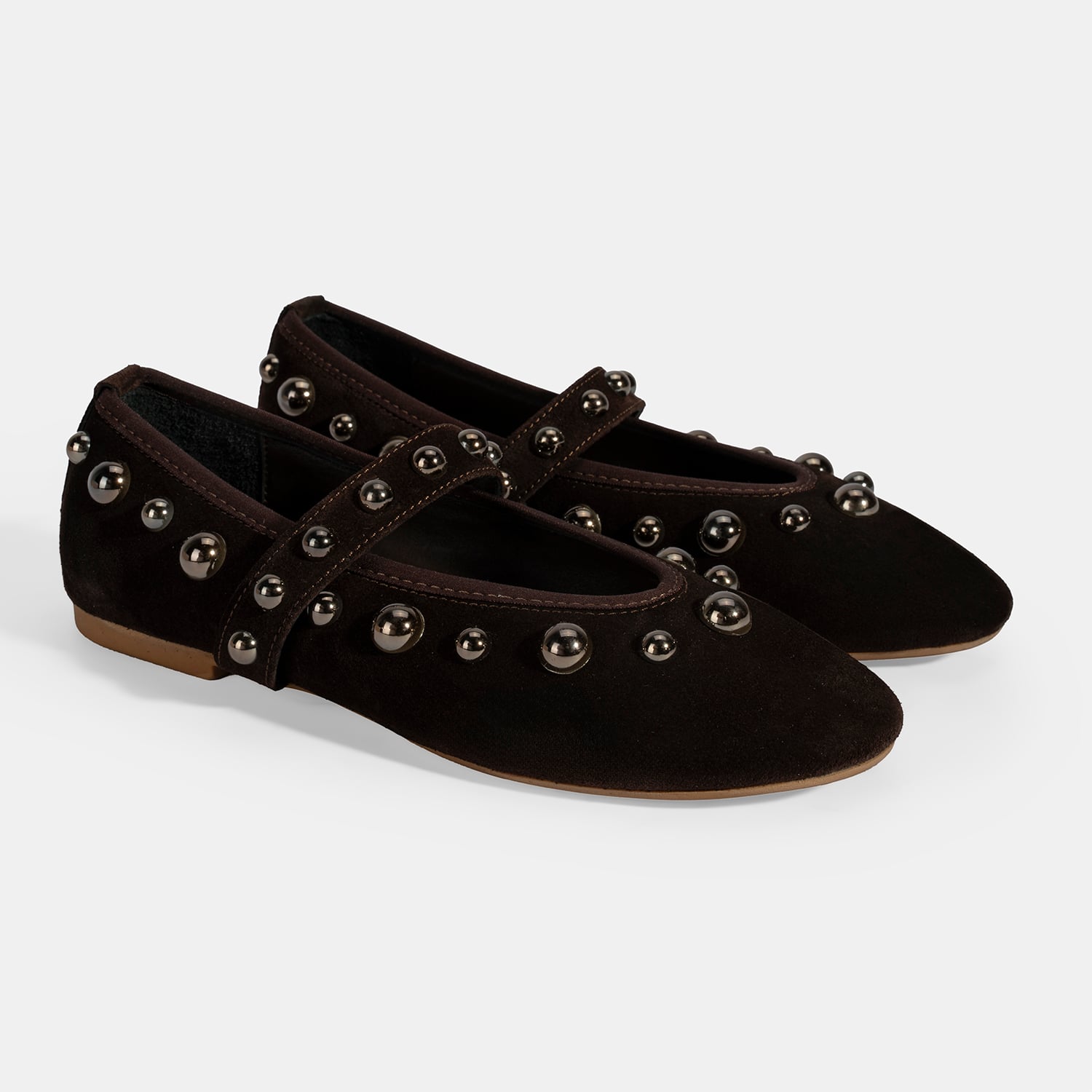 %100 süet deri, deri iç tabanlı, deri astarlı, metal trok detaylı, TPU tabanlı, yuvarlak burunlu, ayarlanabilir metal tokalı kadın Mary Jane babet. Topuk yüksekliği: 1 cm.