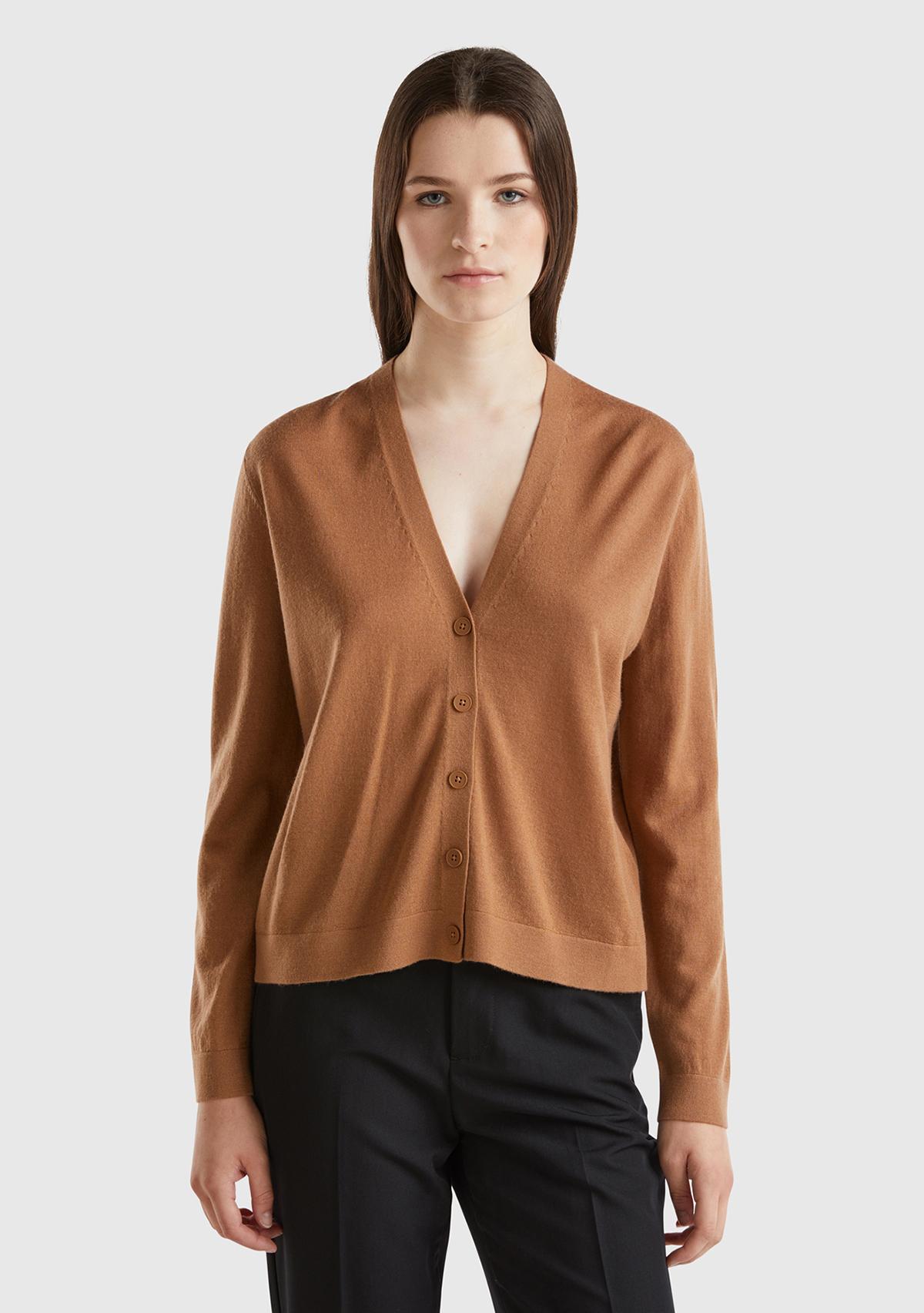 Kadın Kahverengi %100 Yün Önü Düğmeli Arkası Yırtmaç Detaylı V Yaka Hırka. Koyun Yünü İçerir