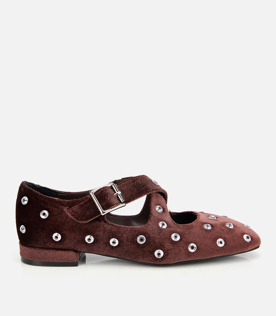 Kadın Kahverengi Kadife Taşlı Çapraz Bantlı Babet