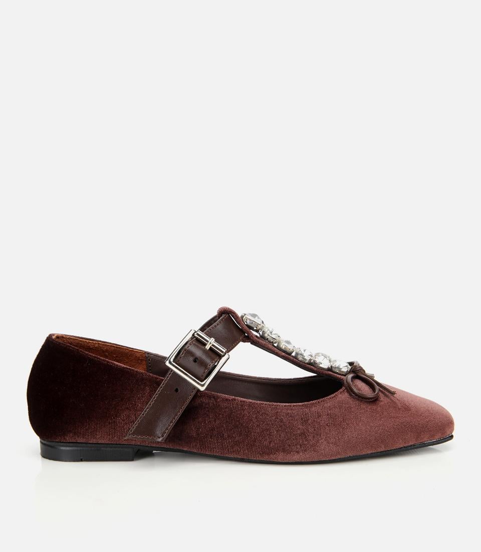 Kadın Kahverengi Kadife Taşlı Fiyonk Detaylı Babet