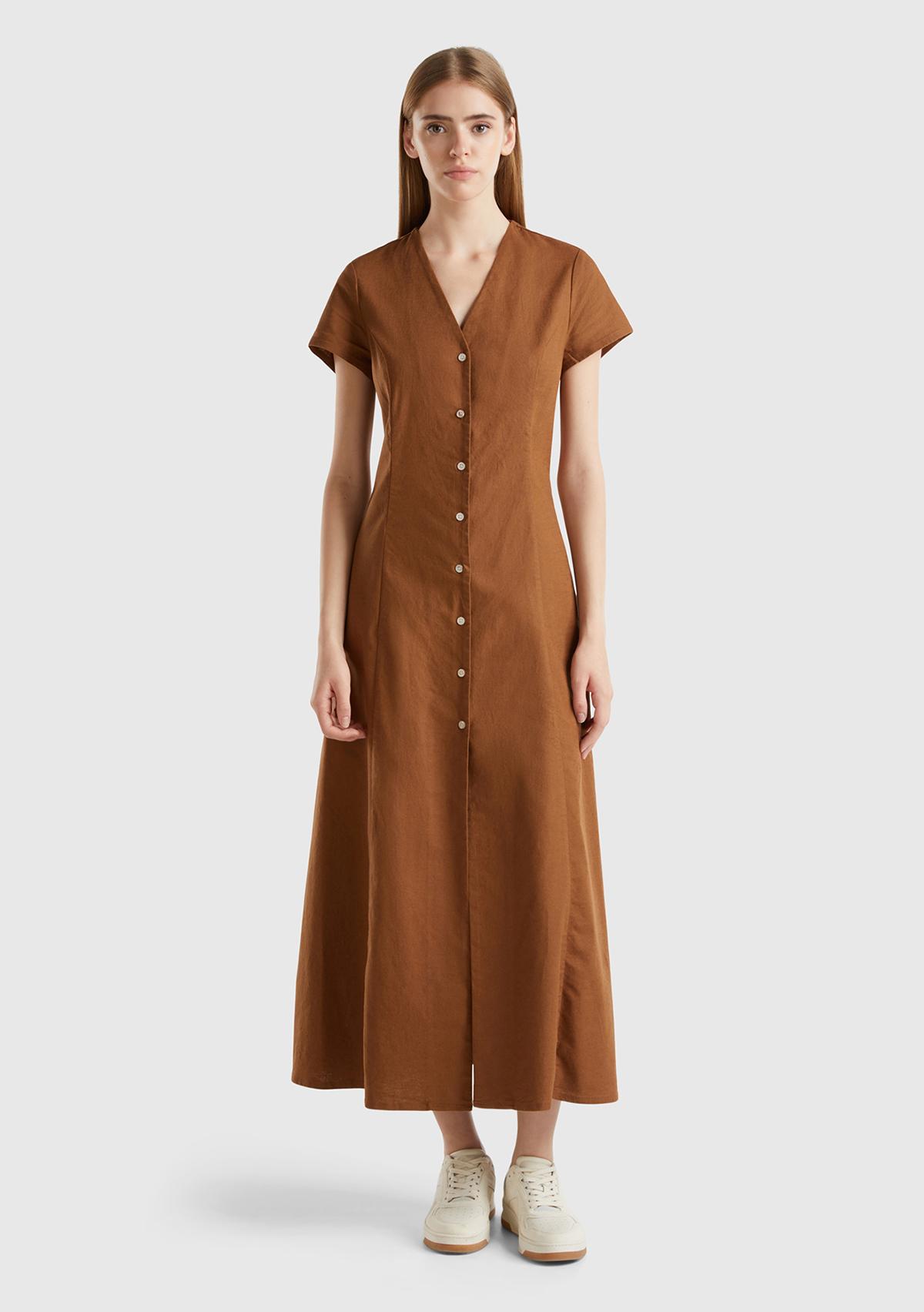 Kadın Kahverengi Keten ve Pamuk Karışımlı Önü Düğmeli Uzun V Yaka Elbise
