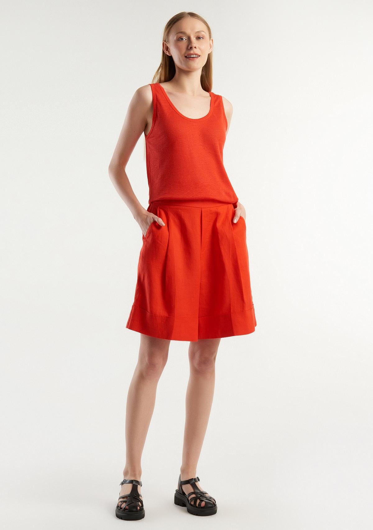 Kadın Kırmızı %100 Keten Beli Lastikli Bermuda Şort
