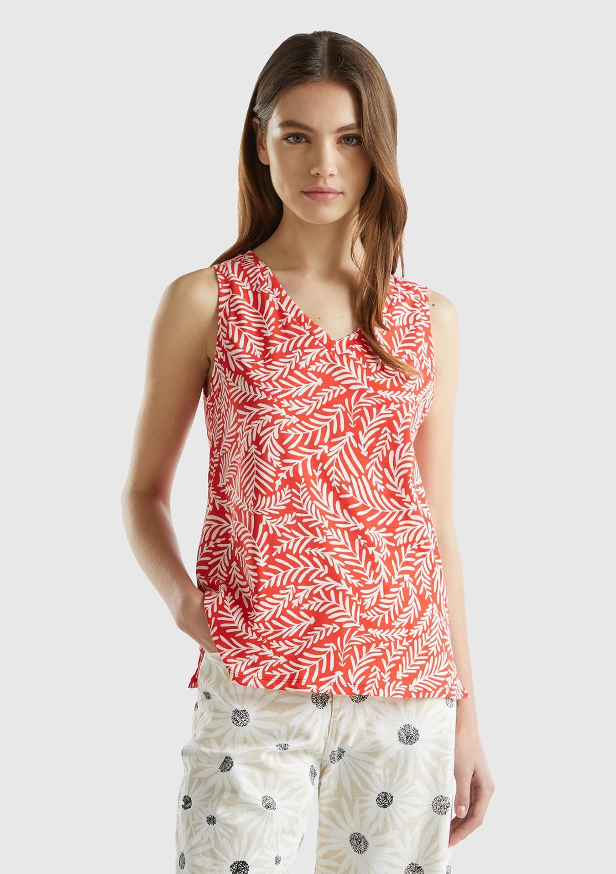 Kadın Kırmızı %100 Pamuk Tamamı Desenli Yırtmaçlı Geniş V Yaka Atlet