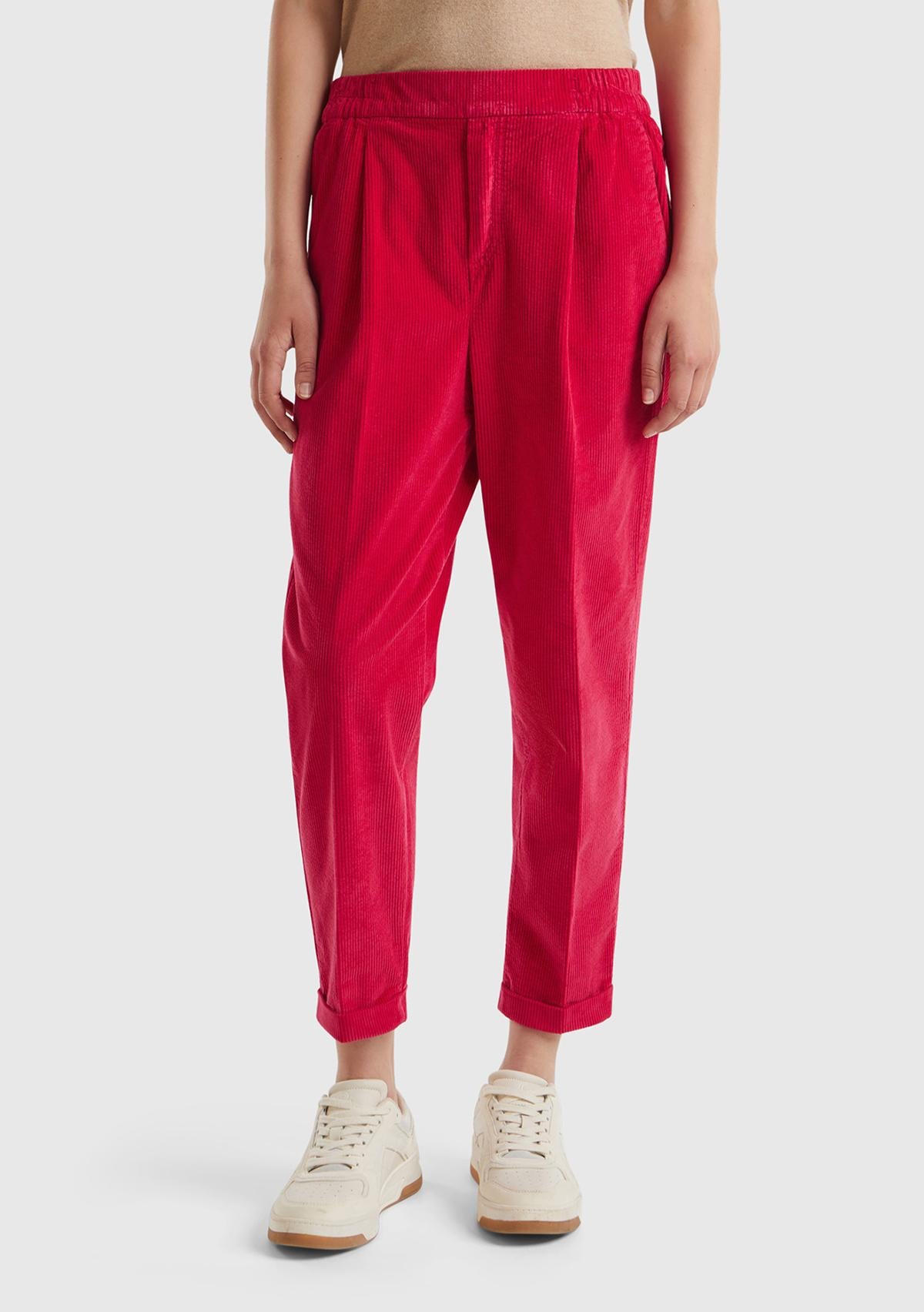 Kadın Kırmızı Beli Lastikli Kadife Pantolon