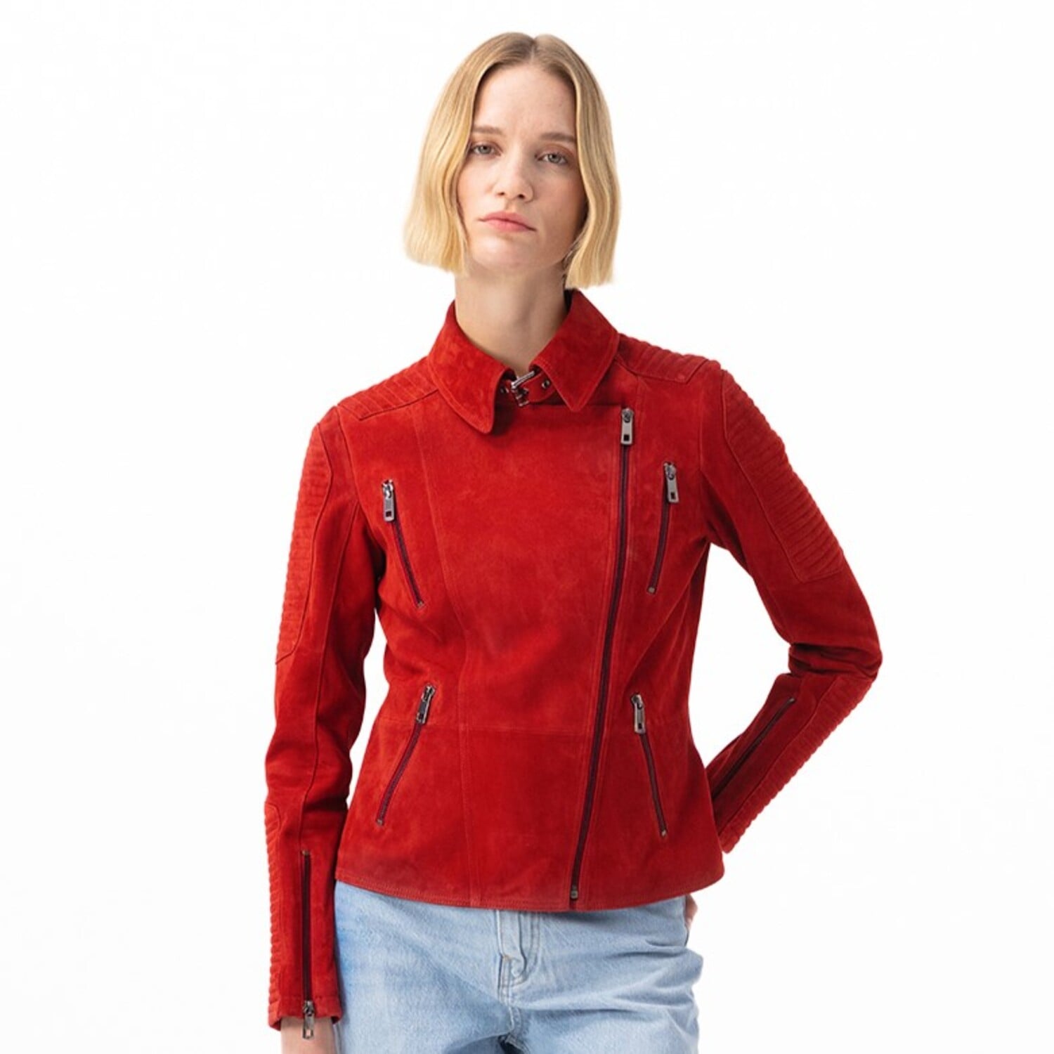Kadın yakalı biker süet deri ceket Önden kruvaze metal fermuar kapamalıdır. Önde dört adet metal fermuarlı cebi mevcuttur. Kollarda metal fermuar detayları bulunmaktadır. omuz ve kollarda kabartma tekniği ile dekoratif dikiş detayı kullanılmıştır. Günlük kullanım için çok uygun ve rahat bir kalıptır. %100 keçi derisinden olup, astarlı çalışılmıştır.. Bu ürünü özel mesajınızla kişiselleştirebilirsiniz. Kişiye özel üretilen veya üzerine mesaj yazılarak kişiselleştirilen ürünlerin iade ve değişimi mümkün değildir. Bu ürün, et endüstrisinin yan ürünü olarak elde edilen ve sürdürülebilir yöntemler ile Leather Working Group Altın sertifikalı Desa tesislerinde tabaklanan deriler kullanılarak üretilmiştir.-Kadın yakalı biker süet deri ceket Önden kruvaze metal fermuar kapamalıdır. Önde dört adet metal fermuarlı cebi mevcuttur. Kollarda metal fermuar detayları bulunmaktadır. omuz ve kollarda kabartma tekniği ile dekoratif dikiş detayı kullanılmıştır. Günlük kullanım için çok uygun ve rahat bir kalıptır. %100 keçi derisinden olup, astarlı çalışılmıştır.. Bu ürünü özel mesajınızla kişiselleştirebilirsiniz. Kişiye özel üretilen veya üzerine mesaj yazılarak kişiselleştirilen ürünlerin iade ve değişimi mümkün değildir. Bu ürün, et endüstrisinin yan ürünü olarak elde edilen ve sürdürülebilir yöntemler ile Leather Working Group Altın sertifikalı Desa tesislerinde tabaklanan deriler kullanılarak üretilmiştir.