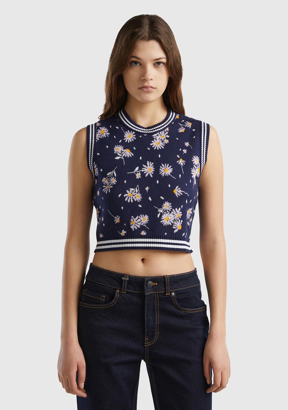 Kadın Koyu Lacivert %100 Pamuk Çiçek Desenli Bisiklet Yaka Crop Süveter