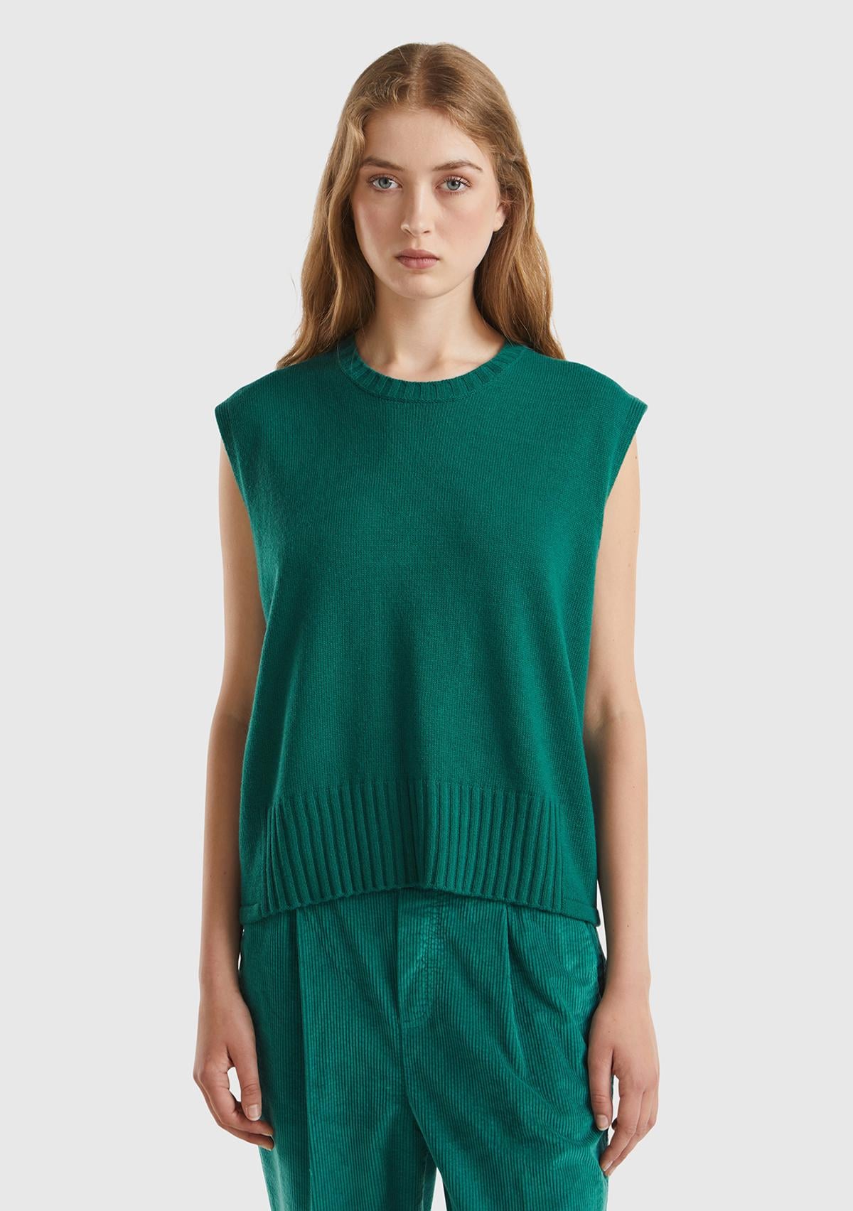 Kadın Koyu Yeşil Yün ve Viskoz Karışımlı Bisiklet Yaka Kolsuz Kazak. Koyun Yünü İçerir
