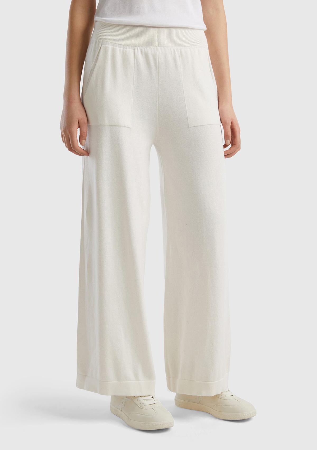 Kadın Krem %100 Koton Geniş Paça Triko Pantolon