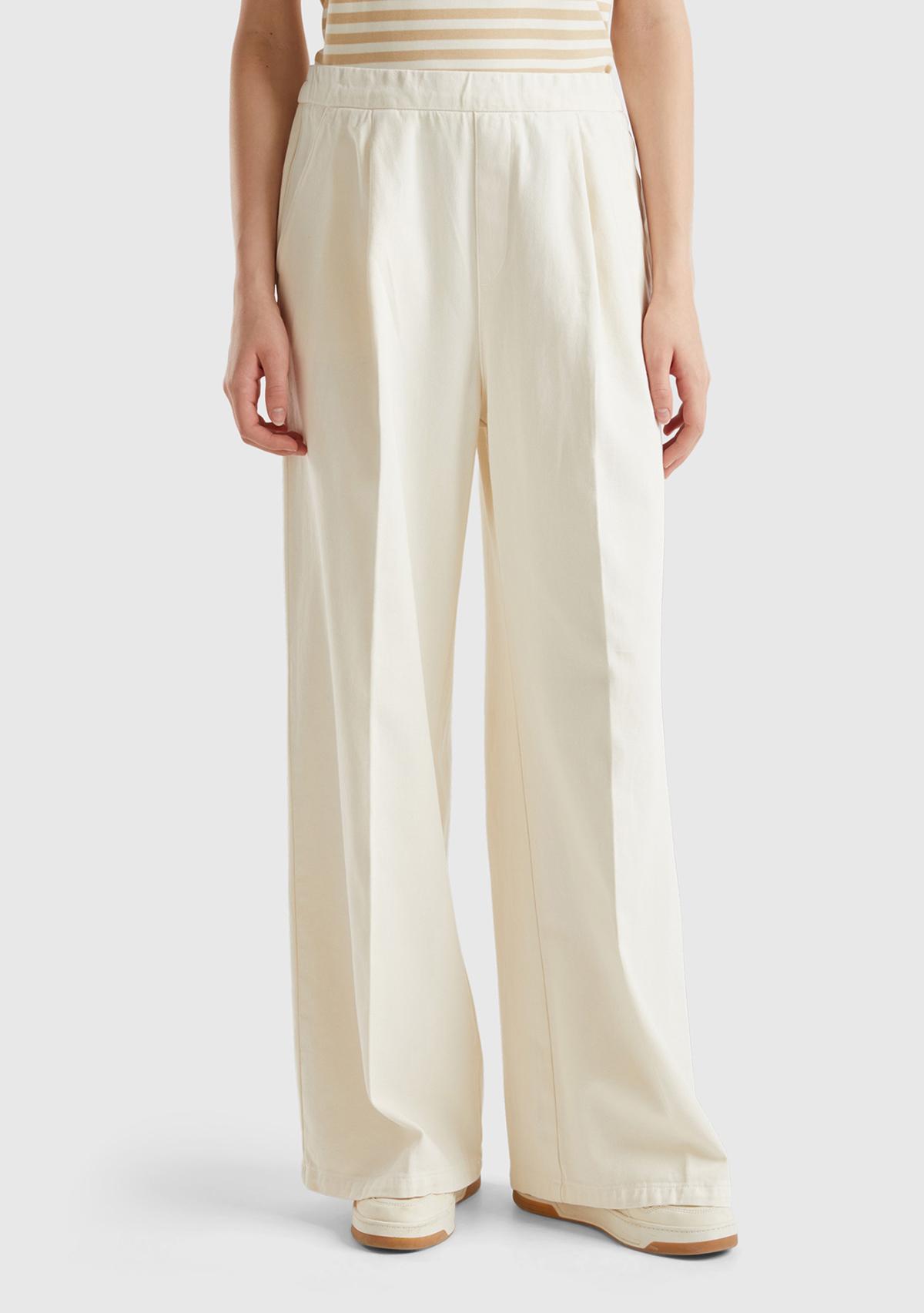 Kadın Krem %100 Pamuk Arkası Elastik Belli Bol Paça Pantolon