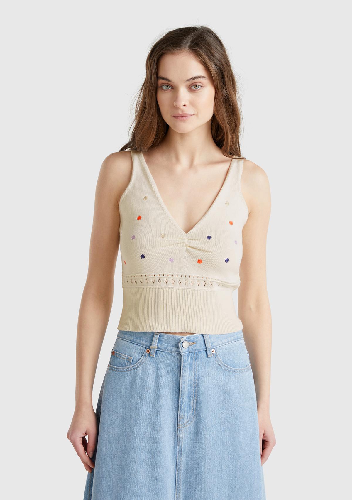 Kadın Krem %100 Pamuk Çiçek İşlemeli Göğsü Büzgülü Regular Fit Triko Atlet