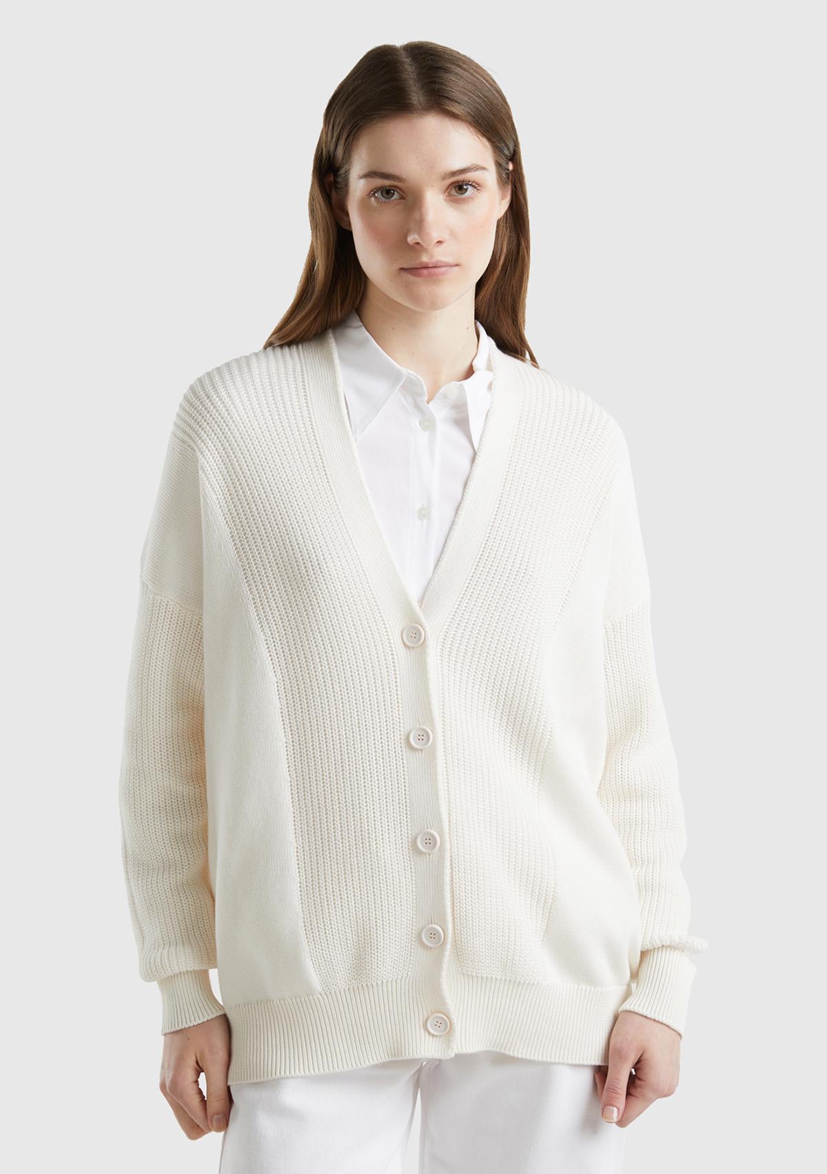 Yumuşak saf pamuk ipliğinden üretilmiş, V yakalı, önü düğmeli, orta uzunluğa sahip kadın hırka. Düz çuval dikişi ve önde yarım balıkçı kaburga örgüsüyle göz alıcı bir seçenek. Sıcak, yumuşak ve özgün hissetmek isteyenler için.