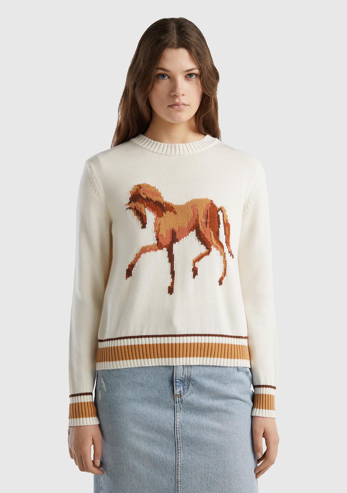 Saf pamuklu kumaştan üretilmiş, ön kısmında at figürü baskısı bulunan, normal kesim uzun kollu kadın kazak. Yakası ve kolları ribana örgülü, arka kısmı logo detaylı. Günlük stile şık ve rahat bir dokunuş yapar. Üretim esnasında kullanılan suyun geri dönüştürüldüğü WASATEX projesi kapsamında sürdürülebilir yollarla üretilmiştir.