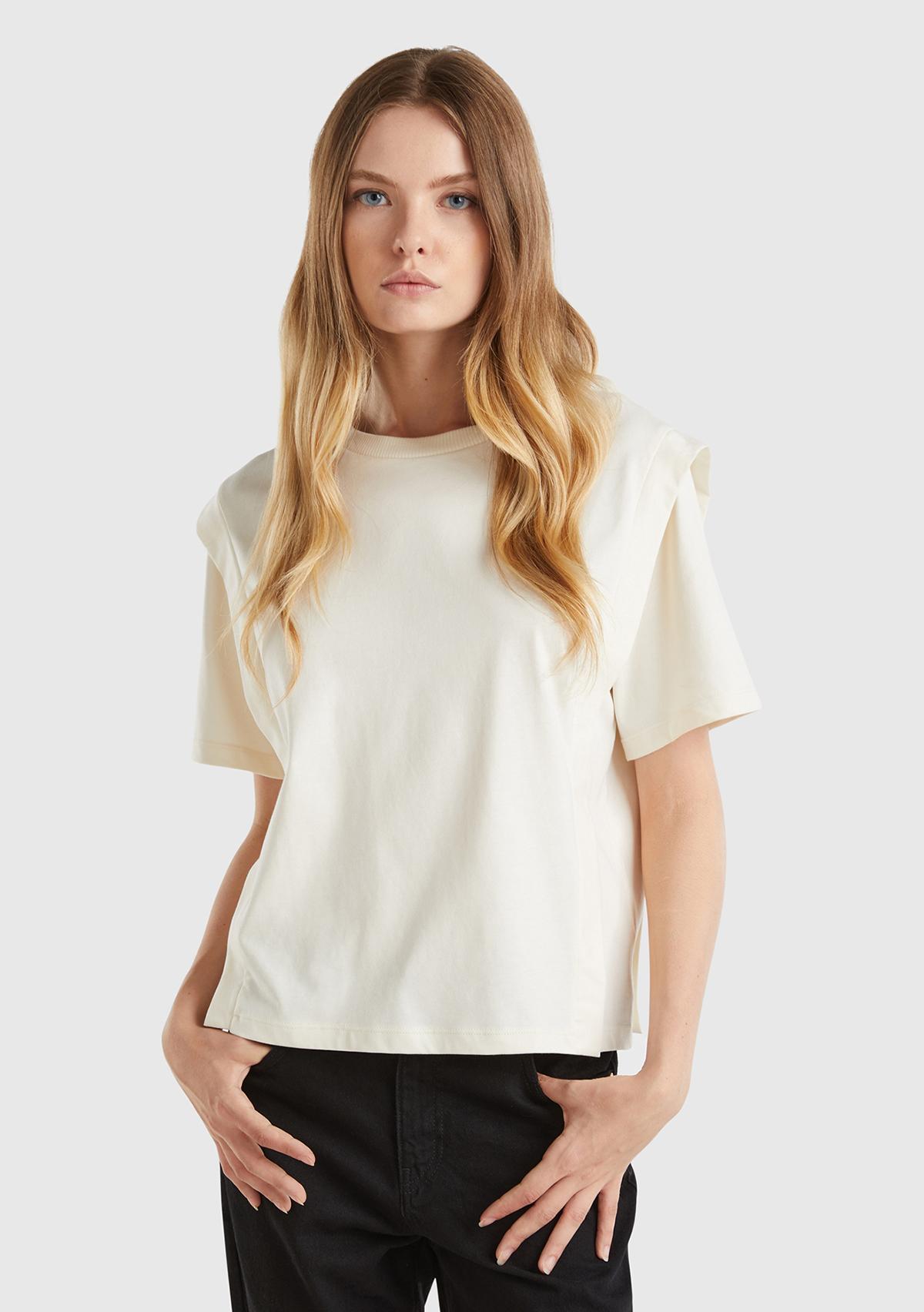 Kadın Krem %100 Pamuk Yarım Kollu Yuvarlak Yaka Düz T-Shirt