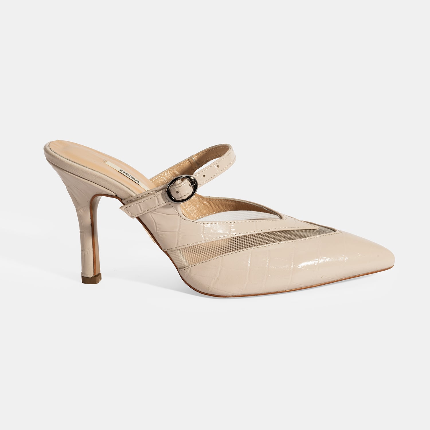 Kadın Krem Ayarlanabilir Tokalı Deri Abiye Topuklu Terlik