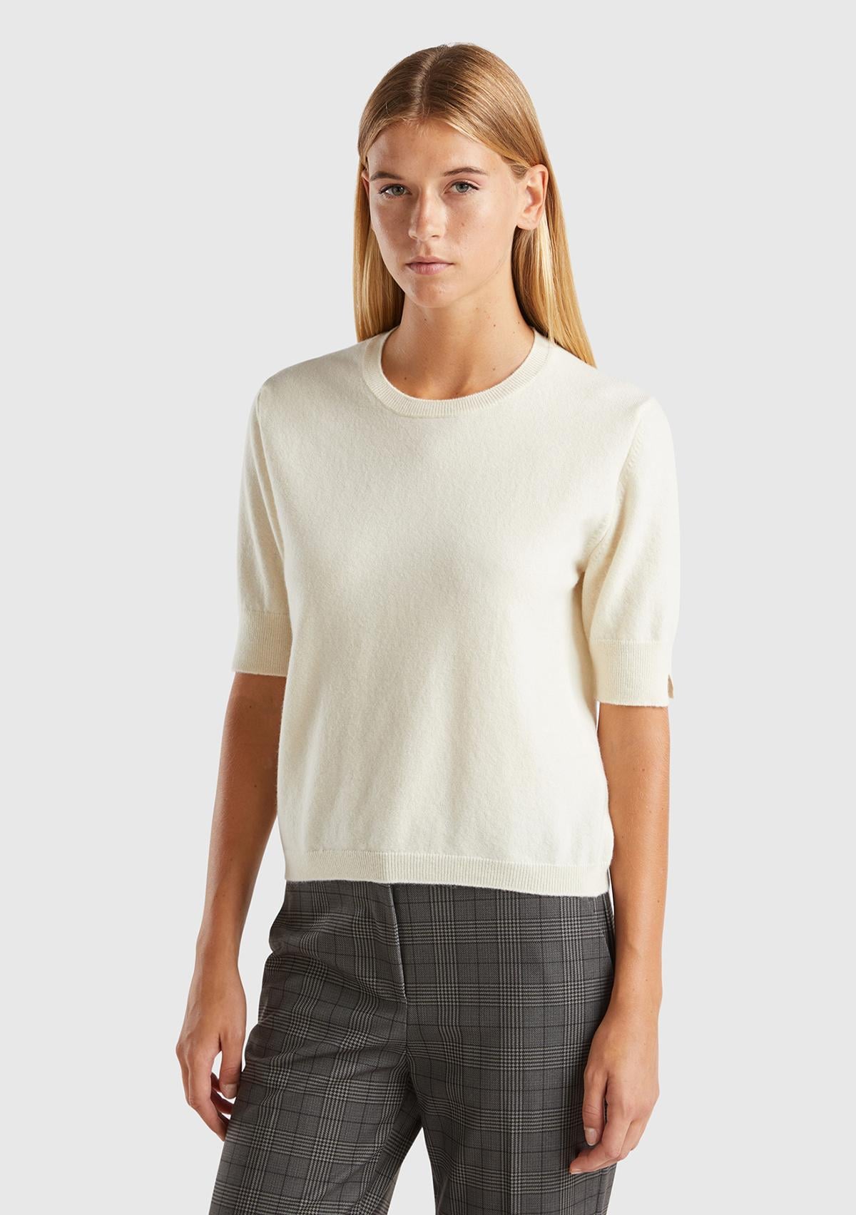 Kadın Krem Bisiklet Yaka %100 Merino Kısa Kollu Kazak