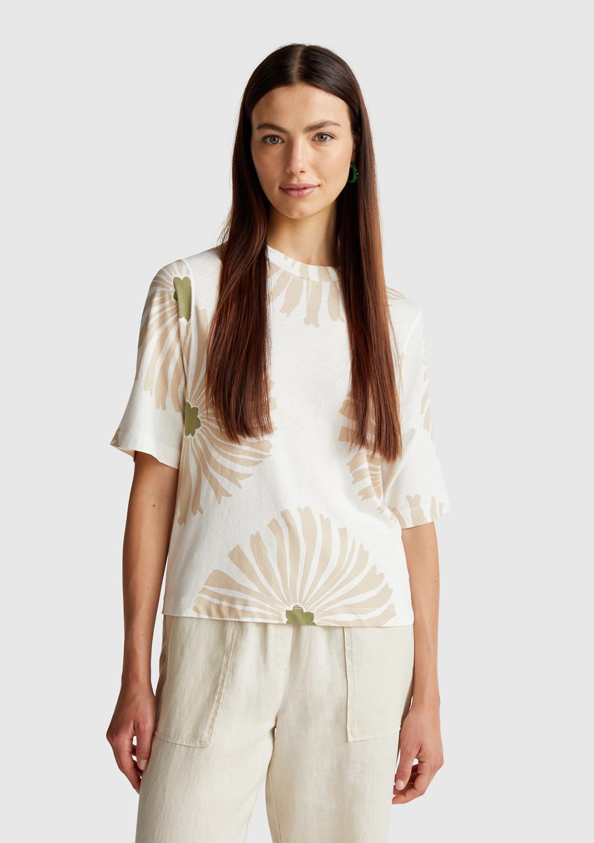 Kadın Krem Keten Karışımlı Boxy Fit Çiçek Desenli T-Shirt