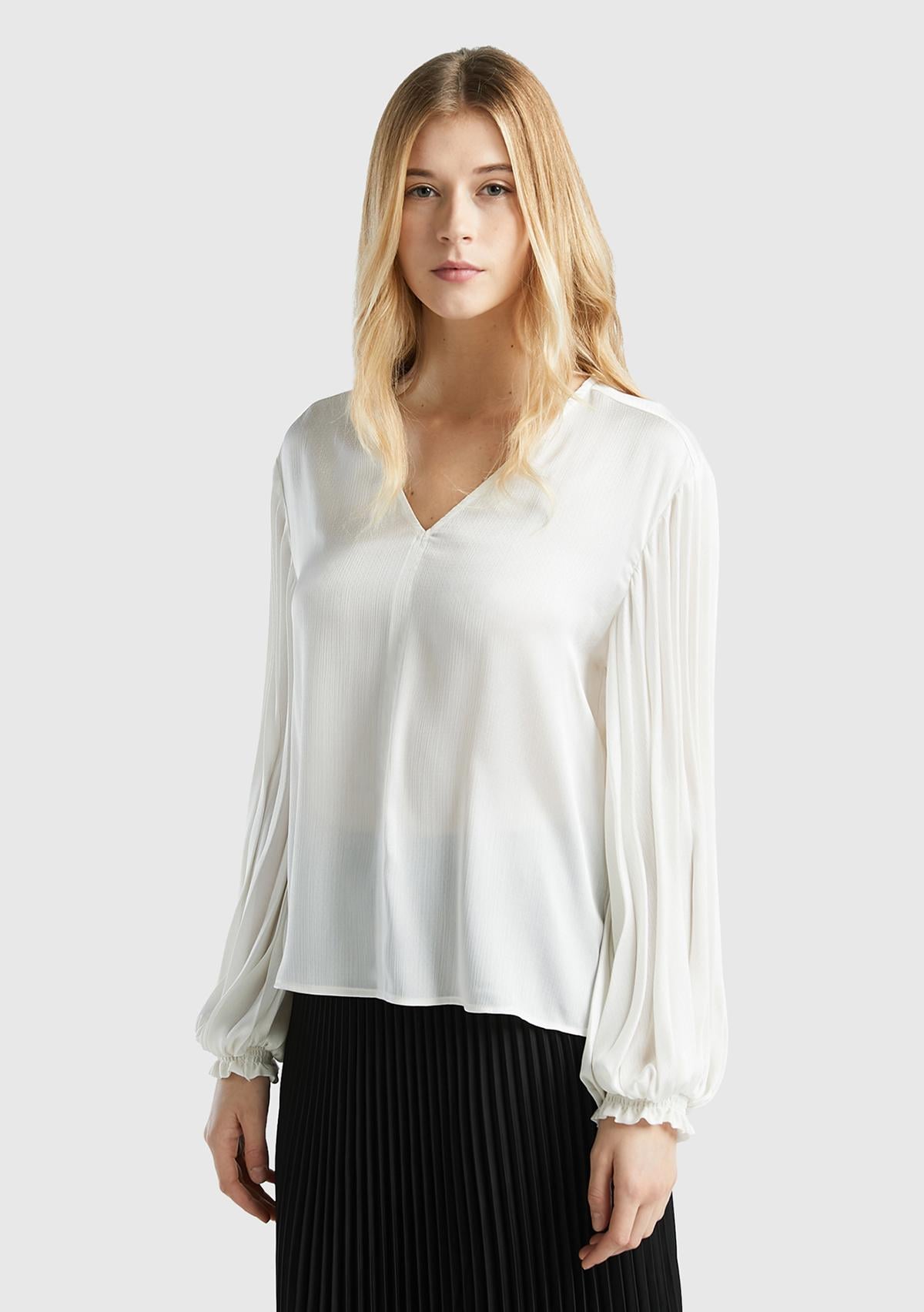 Yumuşak dokulu kumaştan üretilmiş, rahat kesim, kolları lastik detaylı kadın V yaka bluz. Ön kısmında yakadan başlayarak aşağıya uzanan dekoratif dikiş detayı bulunur. Pileli, geniş ve lastikli kol tasarımı günlük giyime şık ve feminen bir hava katar.