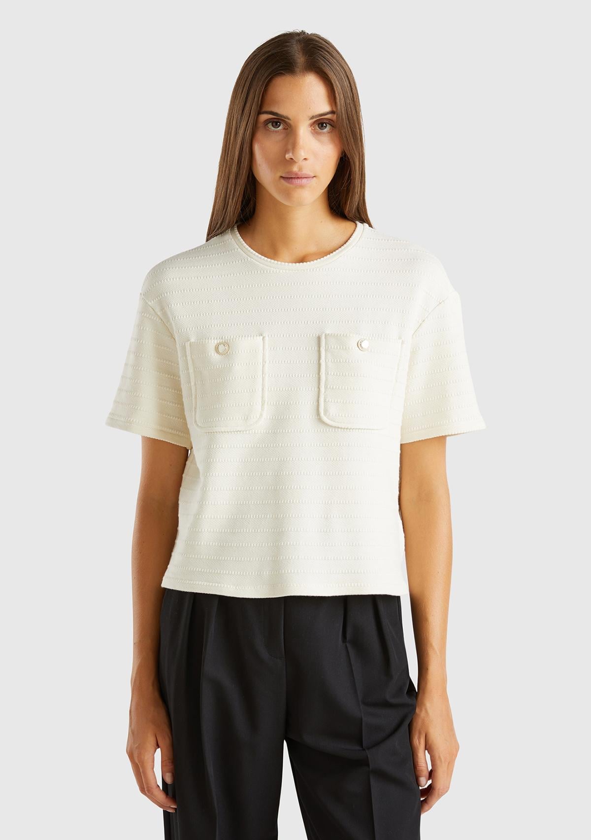 Kadın Krem Pamuk Karışımlı Önü Cep Detaylı Yuvarlak Yaka Kısa T-Shirt