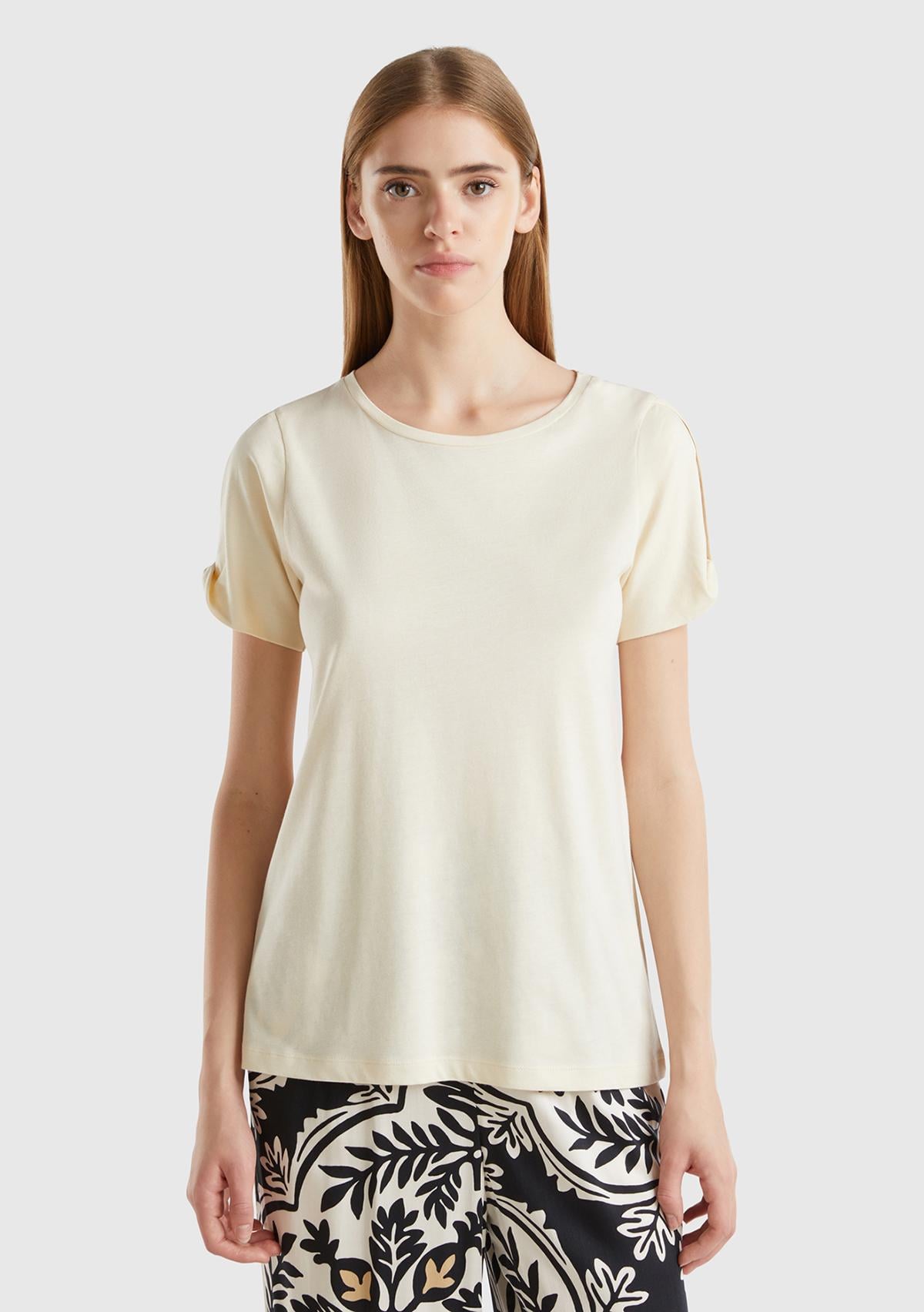 Kadın Krem Pamuk ve Modal Karışımlı Kol Detaylı Yuvarlak Yaka T-Shirt