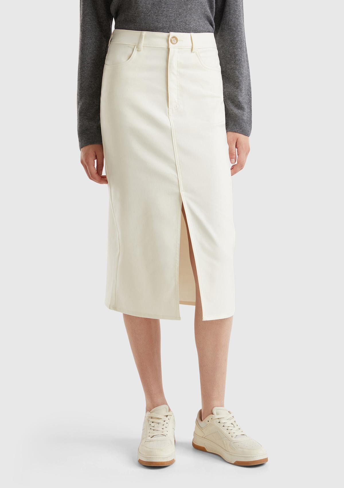 Kadın Krem Pamuk ve Viskoz Karışımlı Ortası Yırtmaçlı Midi Etek