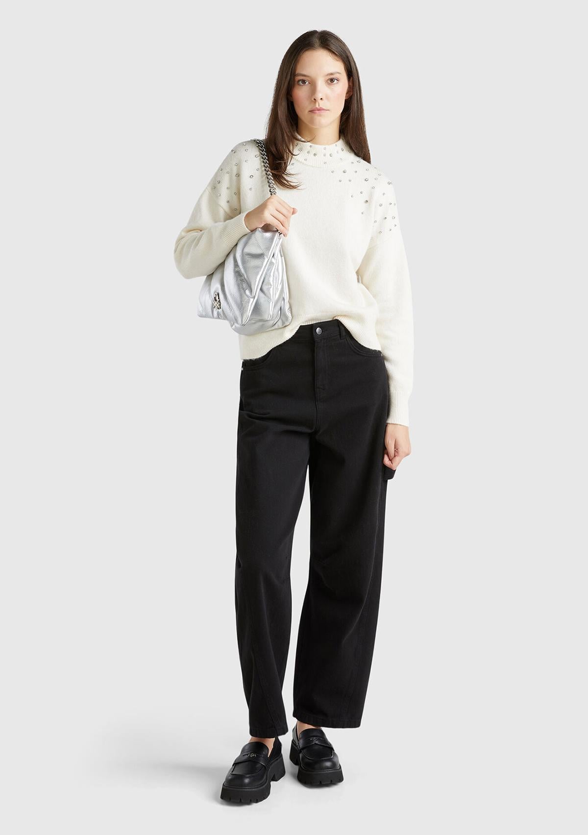 Kadın Krem Pamuk ve Yün Karışımlı Taş Detaylı Yüksek Yaka Kazak