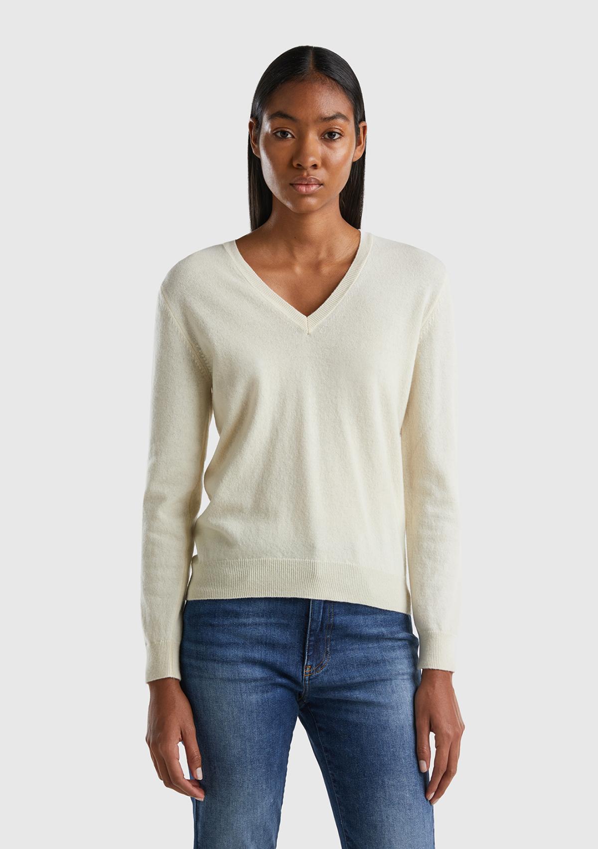Kadın Krem V Yaka %100 Merino Kazak. Koyun Yünü İçerir