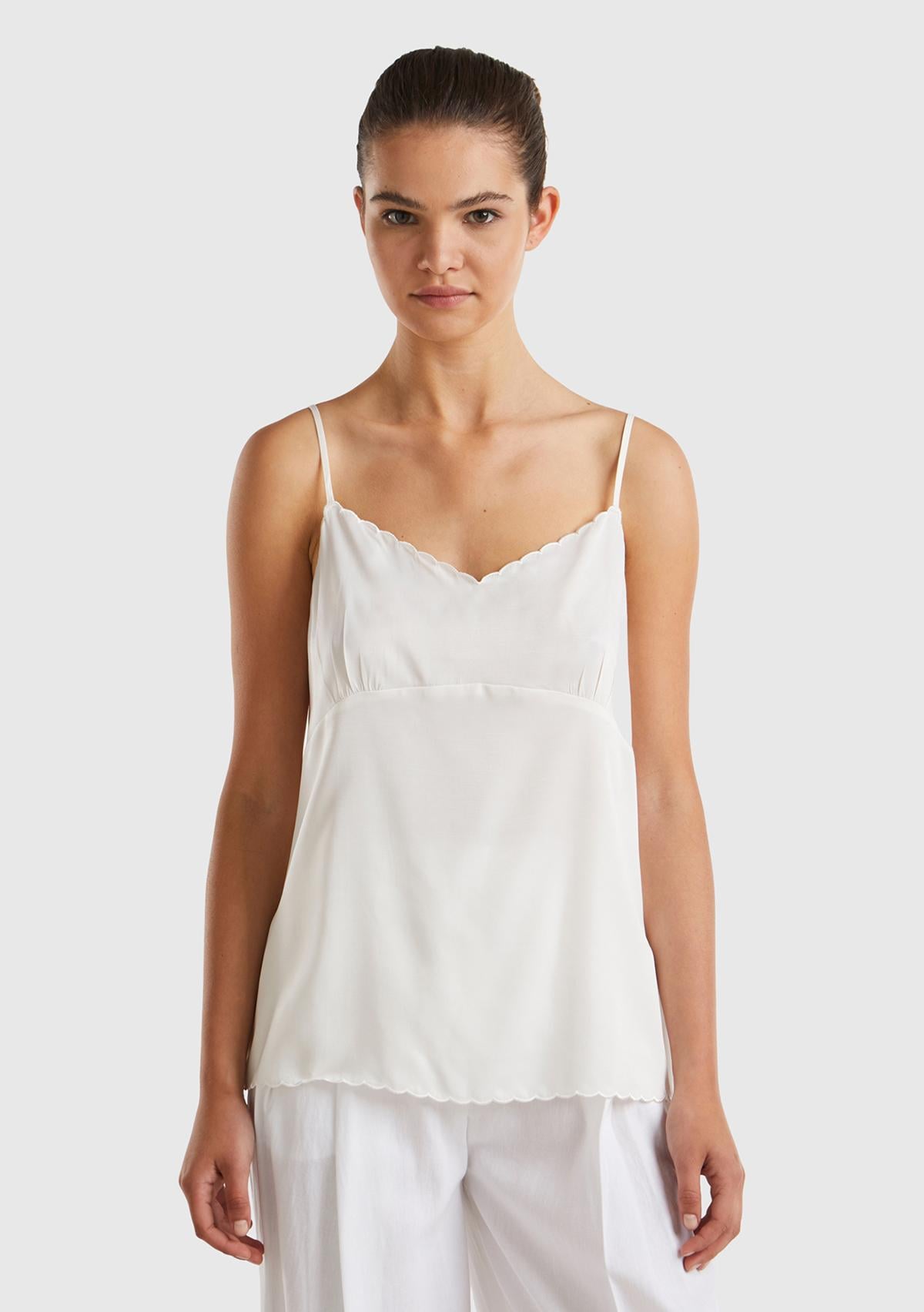 Kadın Krem Viskon Karışımlı Göğsü ve Etek Ucu Fırfırlı İnce Askılı Bluz