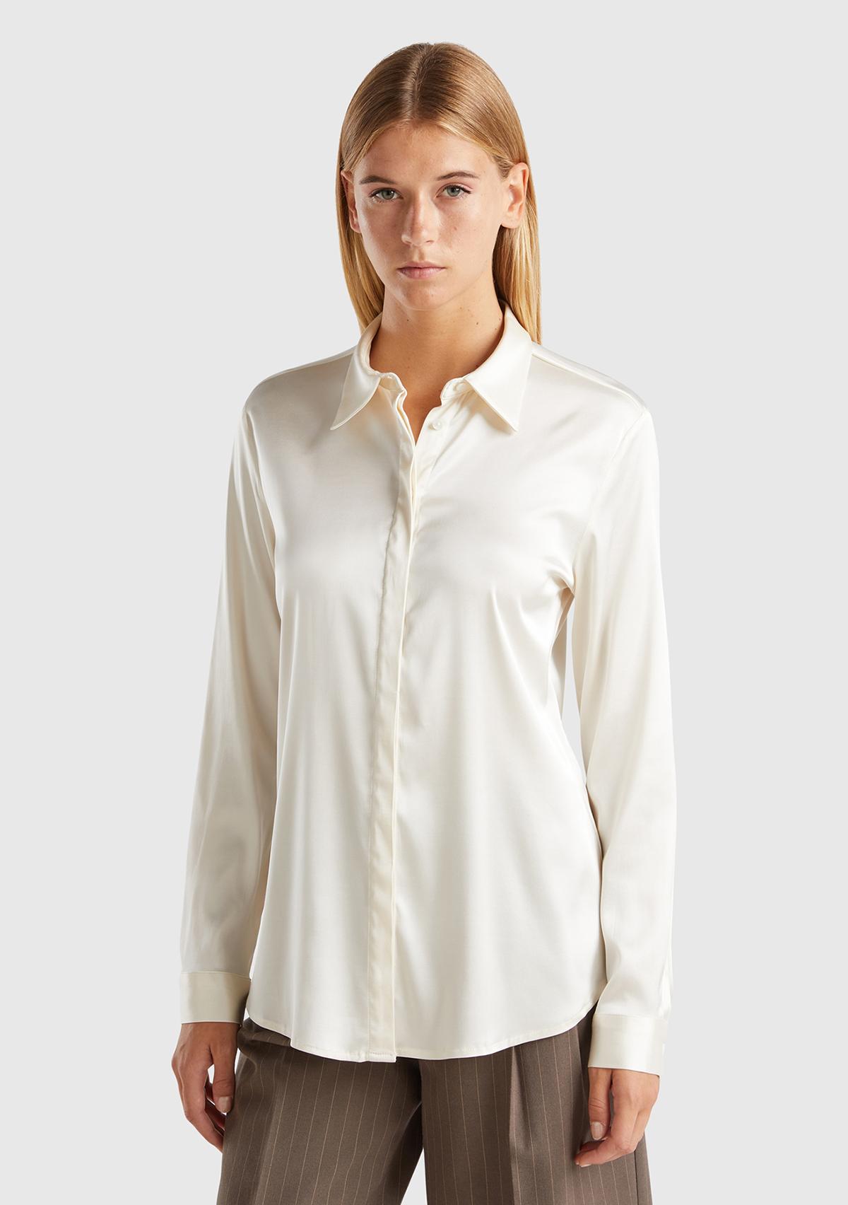 Kadın Krem Viskoz Karışımlı Gizli Düğmeli Sivri Yaka Saten Gömlek