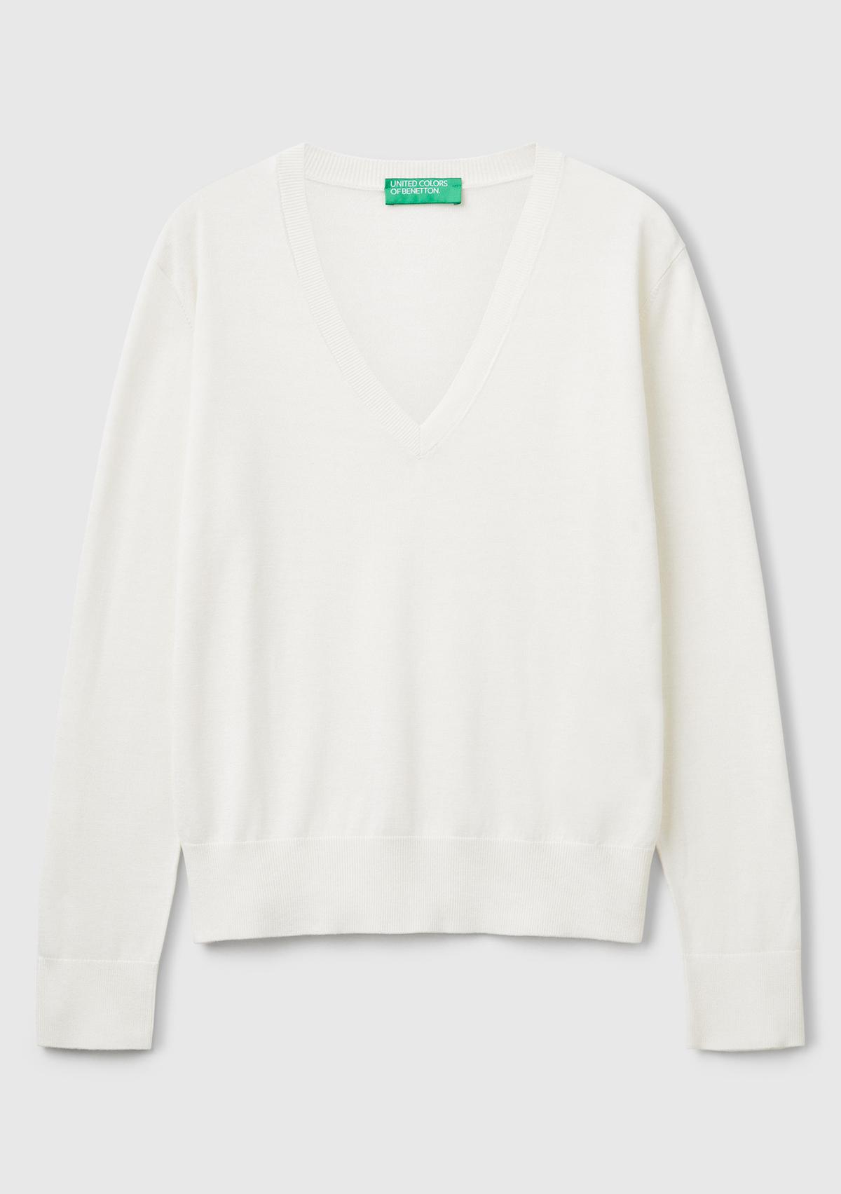 Kadın Krem Viskoz ve İpek Karışımlı V Yaka Triko Kazak