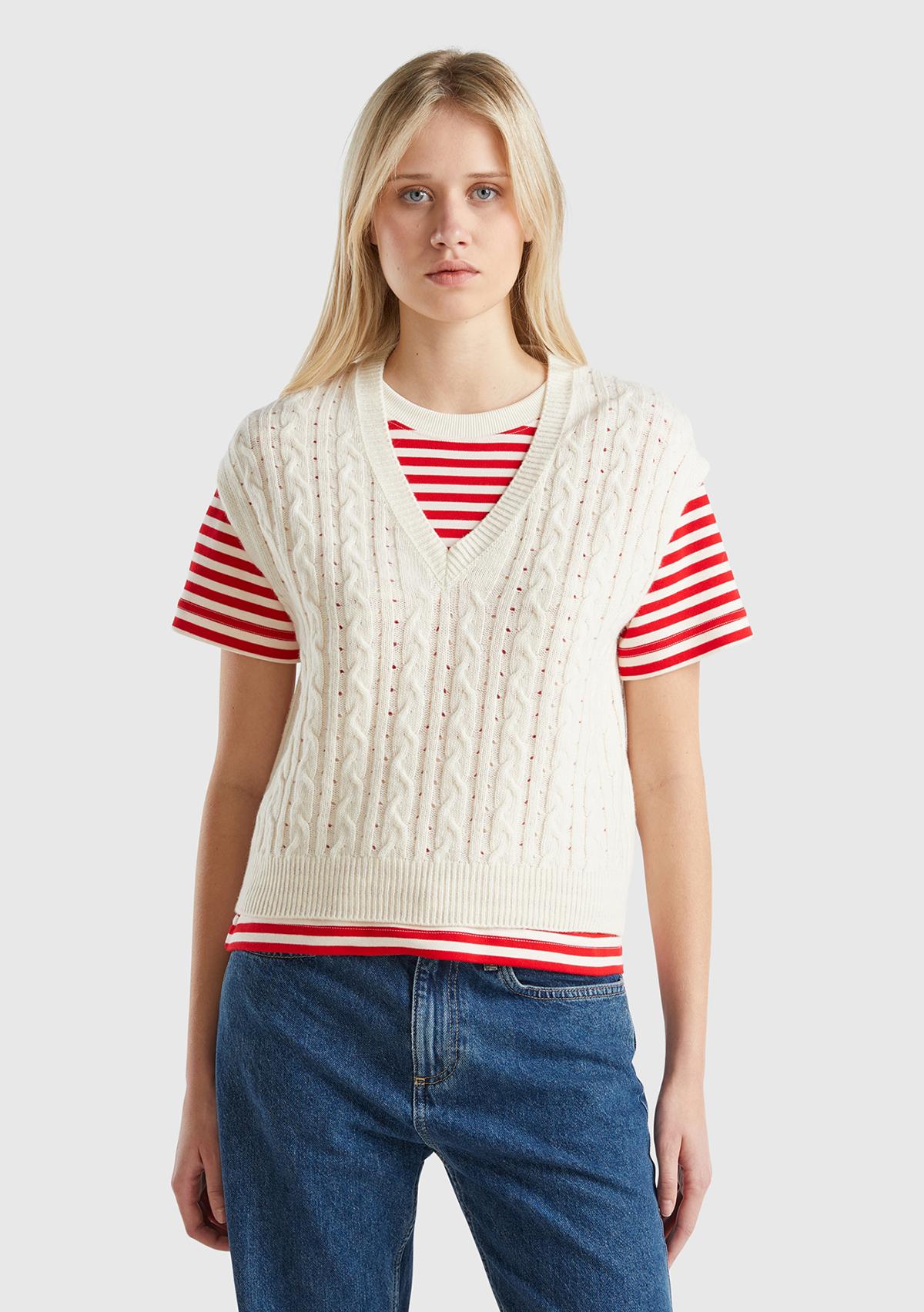 Kadın Krem Yün Karışımlı Örgü Detaylı V Yaka Kazak. Koyun Yünü İçerir