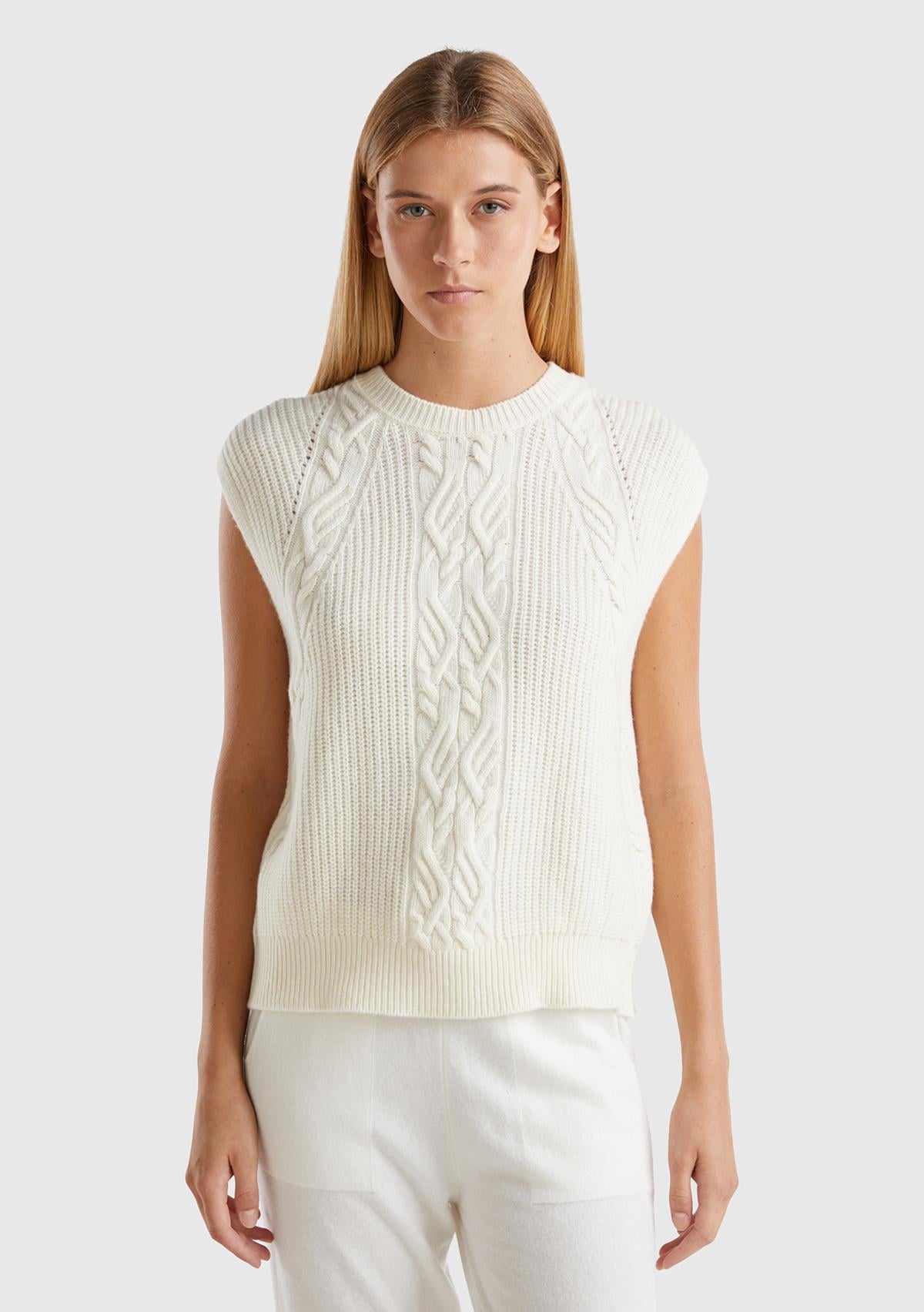 Kadın Krem Yün Karışımlı Örgü Motifli Yuvarlak Yaka Yelek. Koyun Yünü İçerir
