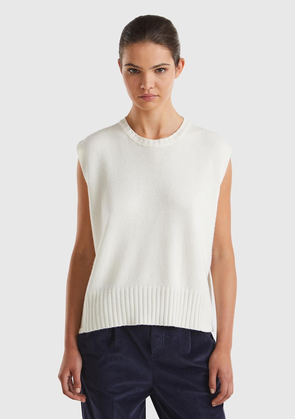 Kadın Krem Yün ve Viskoz Karışımlı Bisiklet Yaka Kolsuz Kazak. Koyun Yünü İçerir
