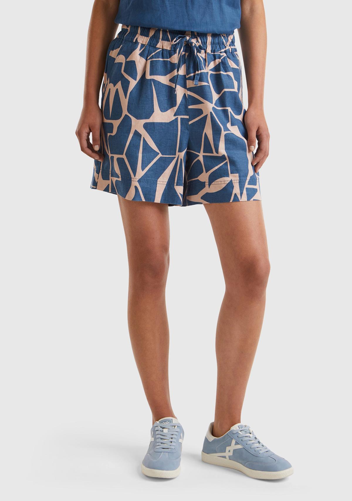 Kadın Lacivert %100 Keten Tamamı Desenli Beli Bağlamalı Şort