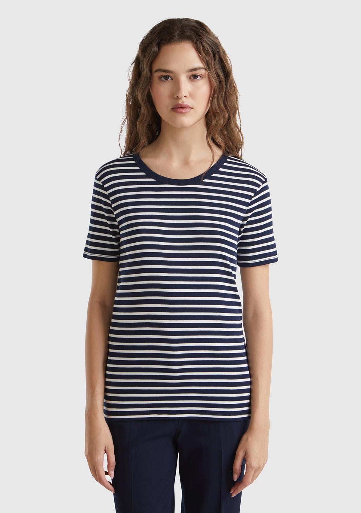 Kadın Lacivert %100 Pamuk Sol Altı Logolu Çizgili Yuvarlak Yaka T-Shirt