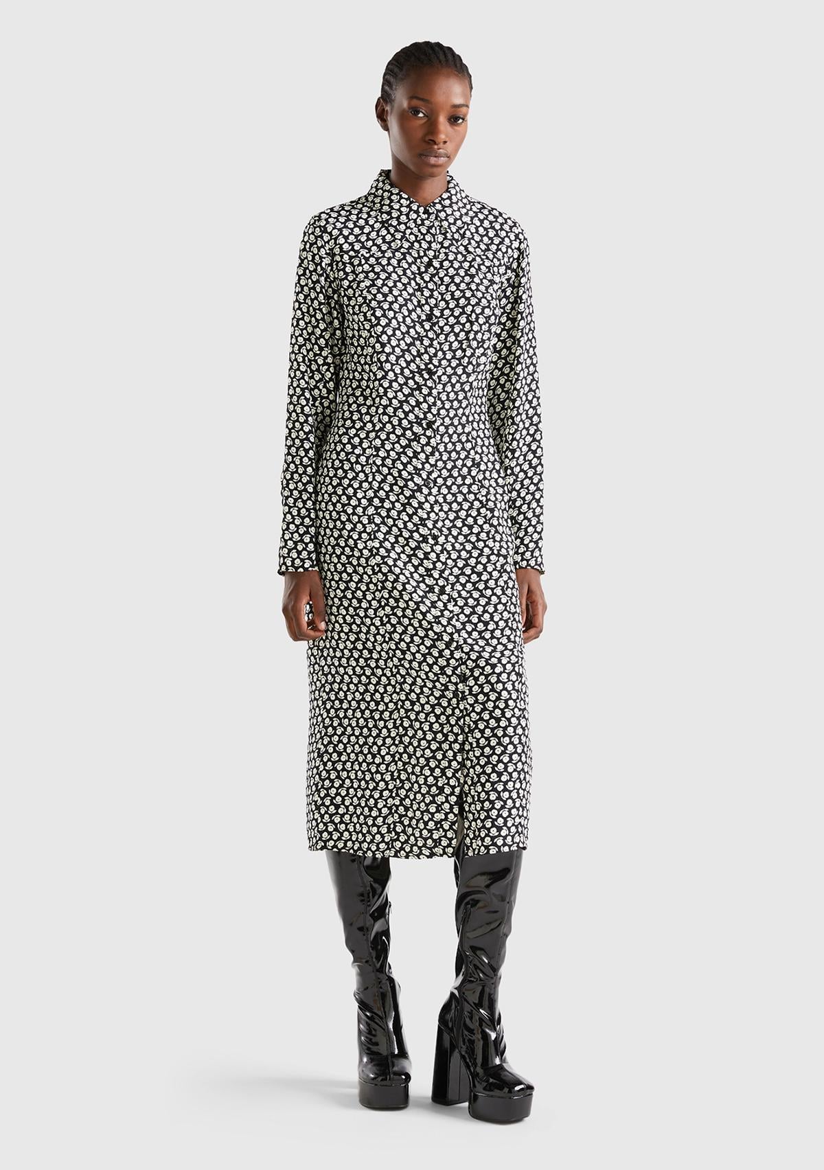 Kadın Lacivert %100 Viskoz Çiçek Desenli Gömlek Yaka Uzun Kollu Elbise