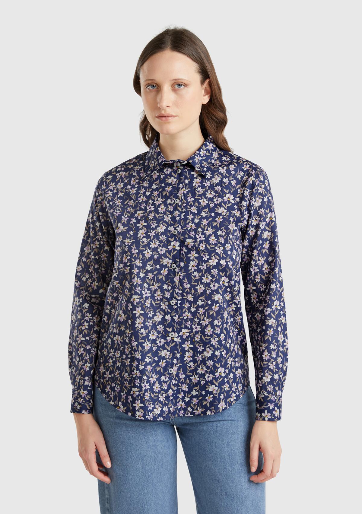 Kadın Lacivert-Çiçekli %100 Pamuk Desenli Manşetli Regular Fit Müslin Gömlek