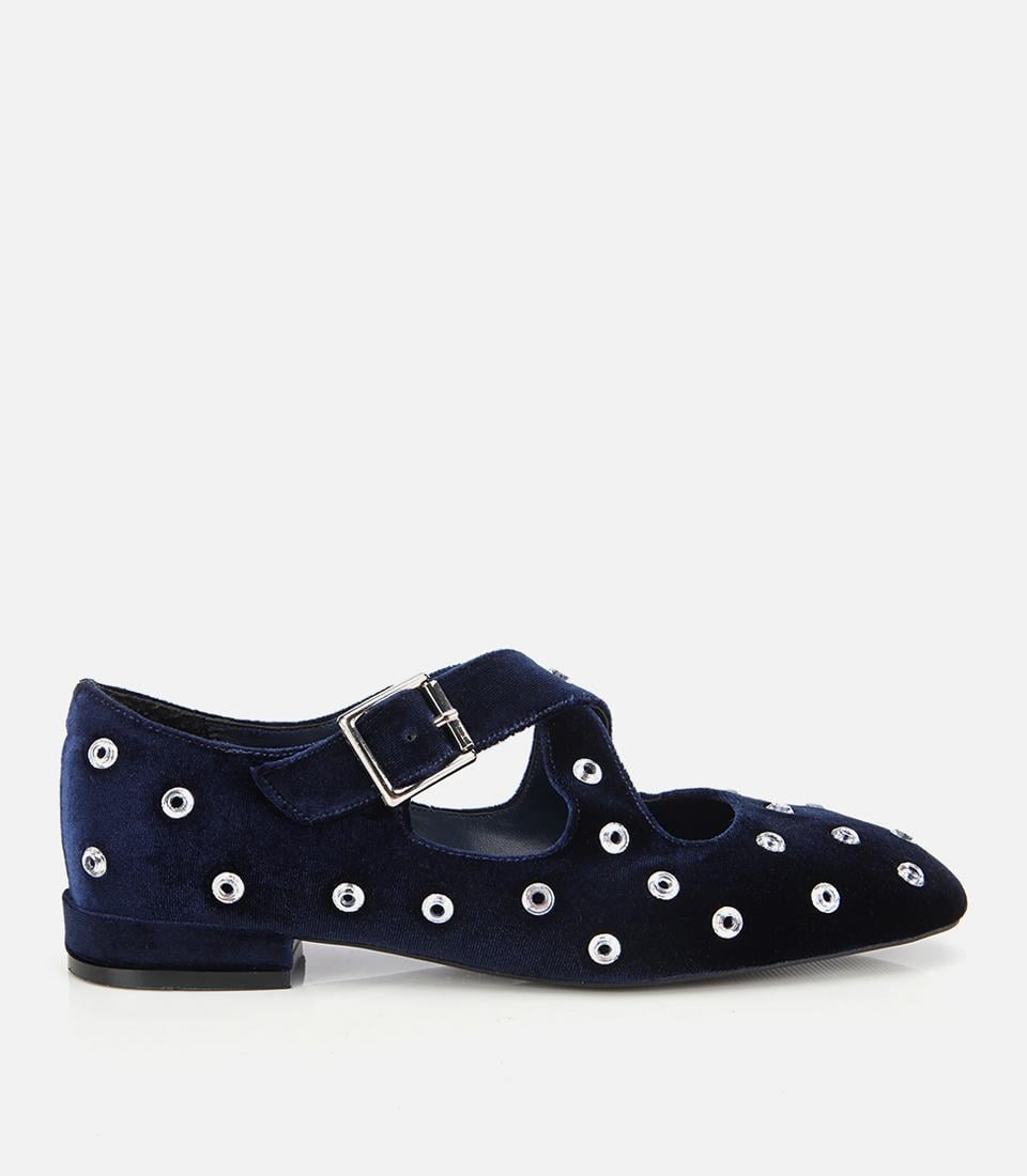 Kadın Lacivert Kadife Taşlı Çapraz Bantlı Babet