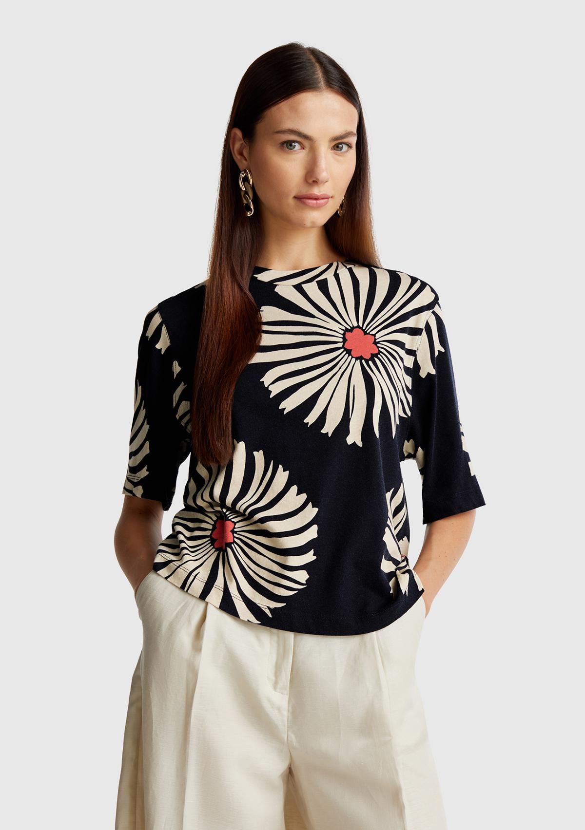 Kadın Lacivert Keten Karışımlı Boxy Fit Çiçek Desenli T-Shirt