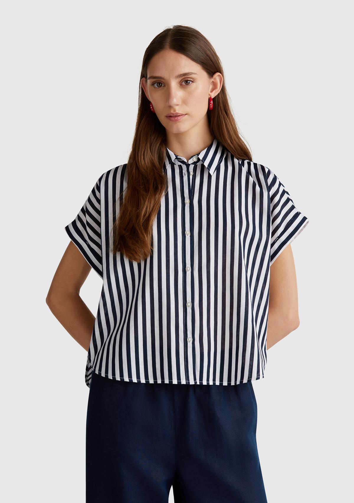Kadın Lacivert Keten Karışımlı Çizgili Kimono Kol Gömlek
