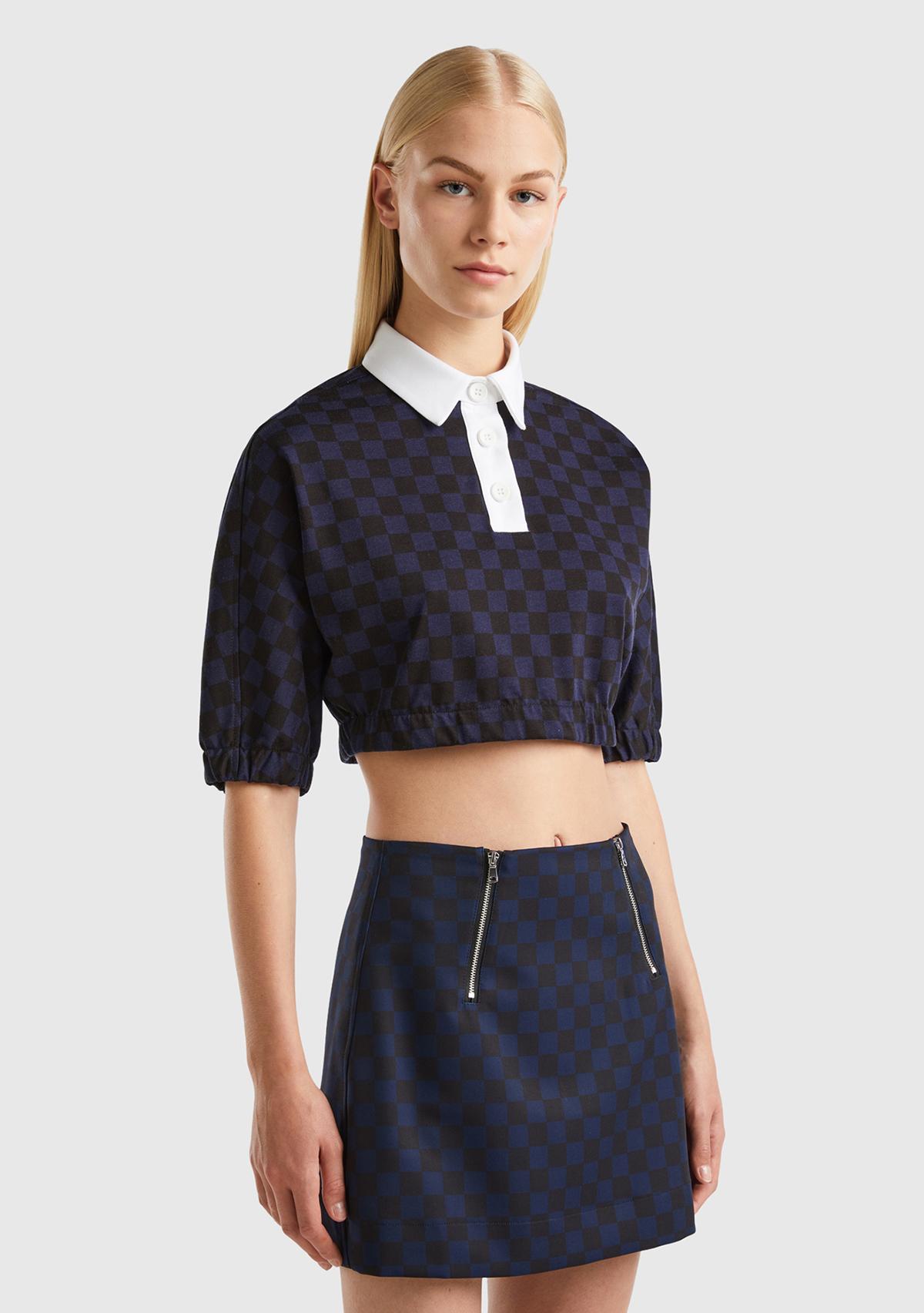 Kadın Lacivert Mix Dama Desenli Kısa Kollu Crop Koton Gömlek