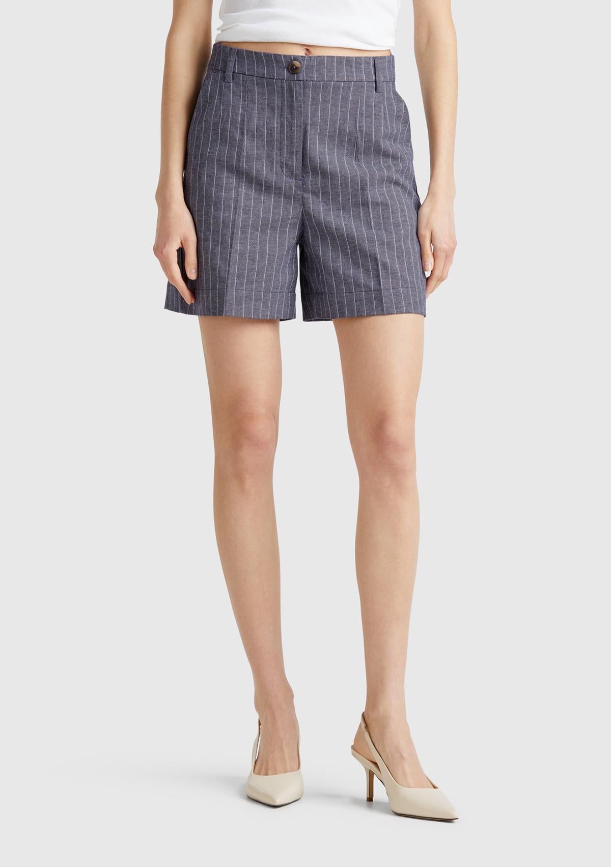 Kadın Lacivert Pamuk ve Keten Karışımlı İnce Çizgi Yüksek Bel Bermuda Şort