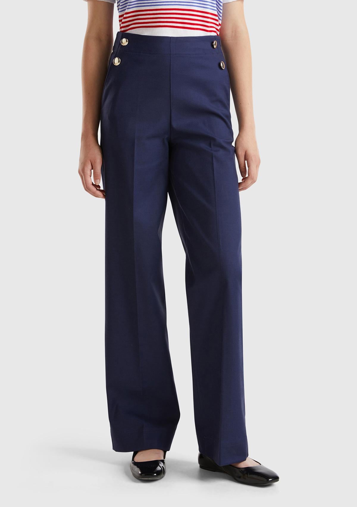 Kadın Lacivert Pamuk ve Viskoz Karışımlı Düğme Detaylı Geniş Paça Pantolon