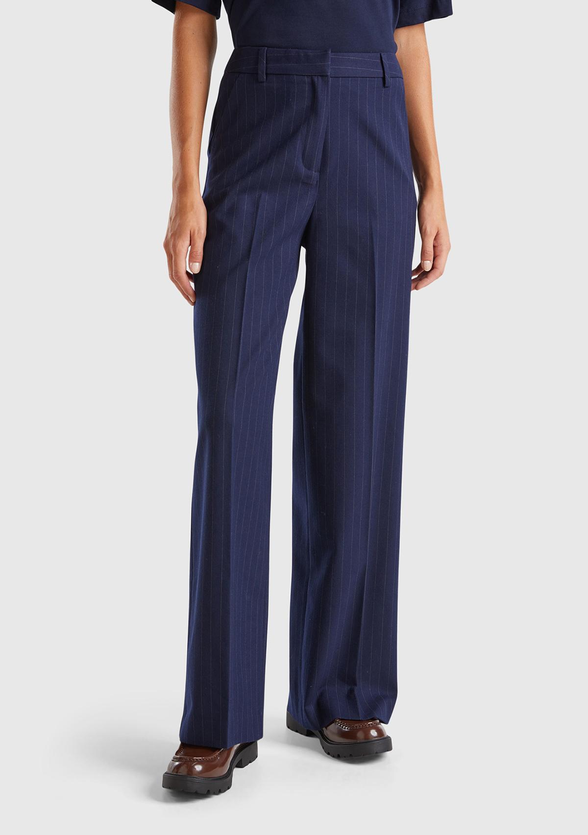 Kadın Lacivert Viskoz Karışımlı Önü Cepli İnce Çizgili Geniş Paça Pantolon